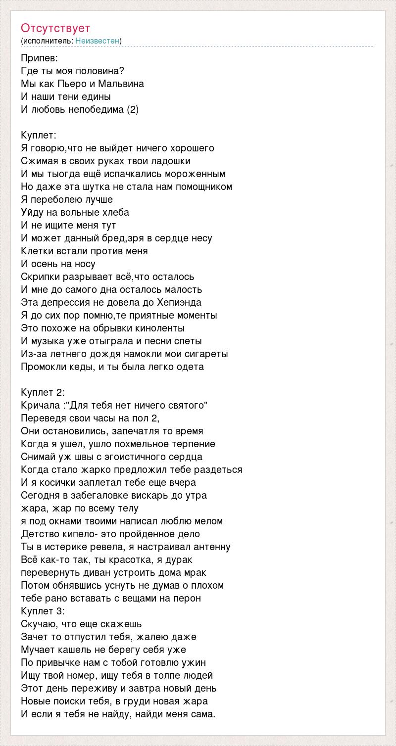 Припев: Где ты моя половина? Мы как Пьеро и Мальвина И наши тени едины И любовь непобедима (2) Куплет: Я говорю,что не выйдет ничего хорошего Сжимая в своих руках твои ладошки И мы тыогда ещё испачкались мороженным Но даже эта шутка не стала нам помощником Я переболею лучше Уйду на вольные хлеба И не ищите меня тут И может данный бред,зря в сердце несу Клетки встали против меня И осень на носу Скрипки разрывает всё,что осталось И мне до самого дна осталось малость Эта депрессия не довела до Хепиэнда Я до сих пор помню,те приятные моменты Это похоже на обрывки киноленты И музыка уже отыграла и песни спеты Из-за летнего дождя намокли мои сигареты Промокли кеды, и ты была легко одета Куплет 2: Кричала :"Для тебя нет ничего святого" Переведя свои часы на пол 2, Они остановились, запечатля то время Когда я ушел, ушло похмельное терпение Снимай уж швы с эгоистичного сердца Когда стало жарко предложил тебе раздеться И я косички заплетал тебе еще вчера Сегодня в забегаловке вискарь до утра жара, жар по всему телу я под окнами твоими написал люблю мелом Детство кипело- это пройденное дело Ты в истерике ревела, я настраивал антенну Всё как-то так, ты красотка, я дурак перевернуть диван устроить дома мрак Потом обнявшись уснуть не думав о плохом тебе рано вставать с вещами на перон Куплет 3: Скучаю, что еще скажешь Зачет то отпустил тебя, жалею даже Мучает кашель не берегу себя уже По привычке нам с тобой готовлю ужин Ищу твой номер, ищу тебя в толпе людей Этот день переживу и завтра новый день Новые поиски тебя, в груди новая жара И если я тебя не найду, найди меня сама.