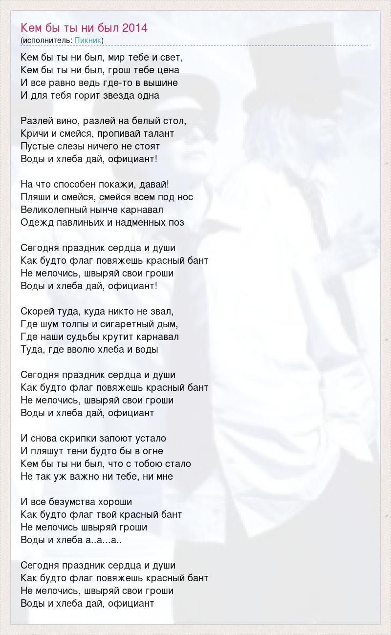 Кем бы ты ни был, мир тебе и свет, Кем бы ты ни был, грош тебе цена И все равно ведь где-то в вышине И для тебя горит звезда одна Разлей вино, разлей на белый стол, Кричи и смейся, пропивай талант Пустые слезы ничего не стоят Воды и хлеба дай, официант! На что способен покажи, давай! Пляши и смейся, смейся всем под нос Великолепный нынче карнавал Одежд павлиньих и надменных поз Сегодня праздник сердца и души Как будто флаг повяжешь красный бант Не мелочись, швыряй свои гроши Воды и хлеба дай, официант! Скорей туда, куда никто не звал, Где шум толпы и сигаретный дым, Где наши судьбы крутит карнавал Туда, где вволю хлеба и воды Сегодня праздник сердца и души Как будто флаг повяжешь красный бант Не мелочись, швыряй свои гроши Воды и хлеба дай, официант И снова скрипки запоют устало И пляшут тени будто бы в огне Кем бы ты ни был, что с тобою стало Не так уж важно ни тебе, ни мне И все безумства хороши Как будто флаг твой красный бант Не мелочись швыряй гроши Воды и хлеба а..а...а.. Сегодня праздник сердца и души Как будто флаг повяжешь красный бант Не мелочись, швыряй свои гроши Воды и хлеба дай, официант