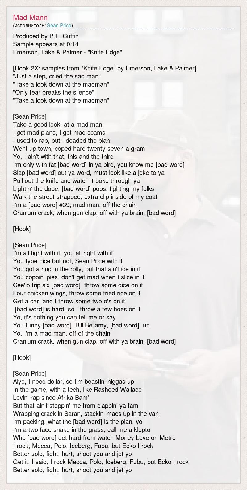 Produced by P.F. Cuttin Sample appears at 0:14 Emerson, Lake & Palmer - "Knife Edge" [Hook 2X: samples from "Knife Edge" by Emerson, Lake & Palmer] "Just a step, cried the sad man" "Take a look down at the madman" "Only fear breaks the silence" "Take a look down at the madman" [Sean Price] Take a good look, at a mad man I got mad plans, I got mad scams I used to rap, but I deaded the plan Went up town, coped hard twenty-seven a gram Yo, I ain't with that, this and the third I'm only with fat [bad word] in ya bird, you know me [bad word] Slap [bad word] out ya word, must look like a joke to ya Pull out the knife and watch it poke through ya Lightin' the dope, [bad word] pops, fighting my folks Walk the street strapped, extra clip inside of my coat I'm a [bad word] #39; mad man, off the chain Cranium crack, when gun clap, off with ya brain, [bad word] [Hook] [Sean Price] I'm all tight with it, you all right with it You type nice but not, Sean Price with it You got a ring in the rolly, but that ain't ice in it You coppin' pies, don't get mad when I slice in it Cee'lo trip six [bad word] throw some dice on it Four chicken wings, throw some fried rice on it Get a car, and I throw some two o's on it [bad word] is hard, so I throw a few hoes on it Yo, it's nothing you can tell me or say You funny [bad word] Bill Bellamy, [bad word] uh Yo, I'm a mad man, off of the chain Cranium crack, when gun clap, off with ya brain, [bad word] [Hook] [Sean Price] Aiyo, I need dollar, so I'm beastin' niggas up In the game, with a tech, like Rasheed Wallace Lovin' rap since Afrika Bam' But that ain't stoppin' me from clappin' ya fam Wrapping crack in Saran, stackin' macs up in the van I'm packing, what the [bad word] is the plan, yo I'm a two face snake in the grass, call me a klepto Who [bad word] get hard from watch Money Love on Metro I rock, Mecca, Polo, Iceberg, Fubu, but Ecko I rock Better solo, fight, hurt, shoot you and jet yo Get it, I said, I rock Mecca, Polo, Iceberg, Fubu, but Ecko I rock Better solo, fight, hurt, shoot you and jet yo