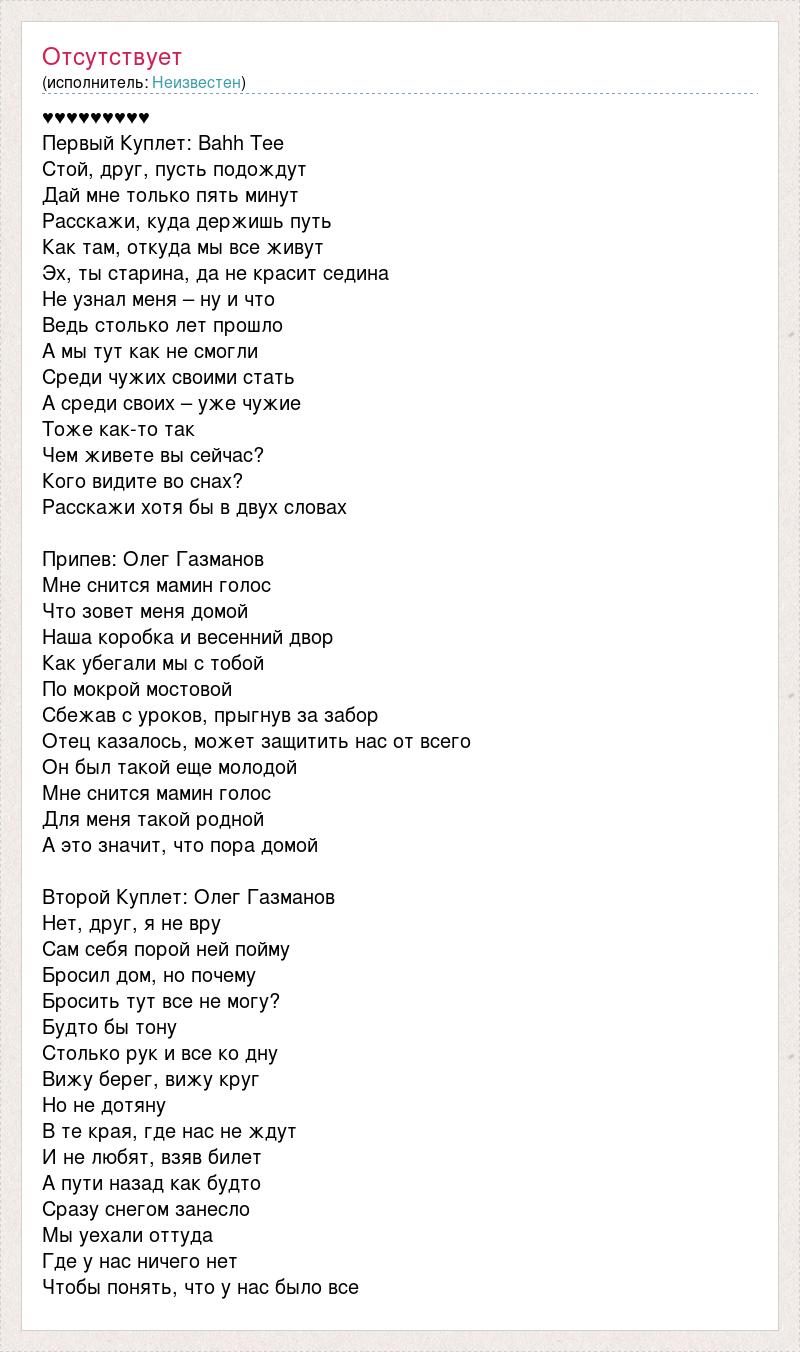 ♥♥♥♥♥♥♥♥♥ Первый Куплет: Bahh Tee Стой, друг, пусть подождут Дай мне только пять минут Расскажи, куда держишь путь Как там, откуда мы все живут Эх, ты старина, да не красит седина Не узнал меня – ну и что Ведь столько лет прошло А мы тут как не смогли Среди чужих своими стать А среди своих – уже чужие Тоже как-то так Чем живете вы сейчас? Кого видите во снах? Расскажи хотя бы в двух словах Припев: Олег Газманов Мне снится мамин голос Что зовет меня домой Наша коробка и весенний двор Как убегали мы с тобой По мокрой мостовой Сбежав с уроков, прыгнув за забор Отец казалось, может защитить нас от всего Он был такой еще молодой Мне снится мамин голос Для меня такой родной А это значит, что пора домой Второй Куплет: Олег Газманов Нет, друг, я не вру Сам себя порой ней пойму Бросил дом, но почему Бросить тут все не могу? Будто бы тону Столько рук и все ко дну Вижу берег, вижу круг Но не дотяну В те края, где нас не ждут И не любят, взяв билет А пути назад как будто Сразу снегом занесло Мы уехали оттуда Где у нас ничего нет Чтобы понять, что у нас было все