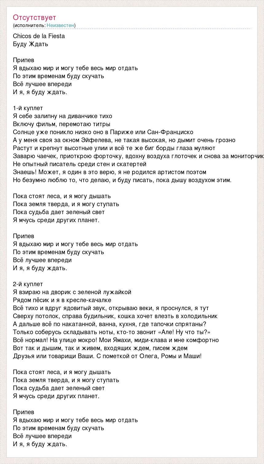 Chicos de la Fiesta Буду Ждать Припев Я вдыхаю мир и могу тебе весь мир отдать По этим временам буду скучать Всё лучшее впереди И я, я буду ждать. 1-й куплет Я себе залипну на диванчике тихо Включу фильм, перемотаю титры Солнце уже поникло низко оно в Париже или Сан-Франциско А у меня своя за окном Эйфелева, не такая высокая, но дымит очень грозно Растут и крепнут высотные улии и всё те же биг борды глаза муляют Заварю чаечек, приоткрою форточку, вдохну воздуха глоточек и снова за мониторчик Не опытный писатель среди стен и скатертей Знаешь! Может, я один в это верю, я не родился артистом поэтом Но безумно люблю то, что делаю, и буду писать, пока дышу воздухом этим. Пока стоят леса, и я могу дышать Пока земля тверда, и я могу ступать Пока судьба дает зеленый свет Я мчусь среди других планет. Припев Я вдыхаю мир и могу тебе весь мир отдать По этим временам буду скучать Всё лучшее впереди И я, я буду ждать. 2-й куплет Я взираю на дворик с зеленой лужайкой Рядом пёсик и я в кресле-качалке Всё тихо и вдруг ядовитый звук, открываю веки, я проснулся, я тут Сверху потолок, справа будильник, кошка хочет влезть в холодильник А дальше всё по накатанной, ванна, кухня, где тапочки спрятаны? Только соберусь складывать ноты, кто-то звонит «Але! Ну что ты?» Всё нормал! На улице мокро! Мои Ямахи, миди-клава и мне комфортно Вот так и дышим, так и живем, входящих ждем, писем ждем Друзья или товарищи Ваши. С пометкой от Олега, Ромы и Маши! Пока стоят леса, и я могу дышать Пока земля тверда, и я могу ступать Пока судьба дает зеленый свет Я мчусь среди других планет. Припев Я вдыхаю мир и могу тебе весь мир отдать По этим временам буду скучать Всё лучшее впереди И я, я буду ждать.