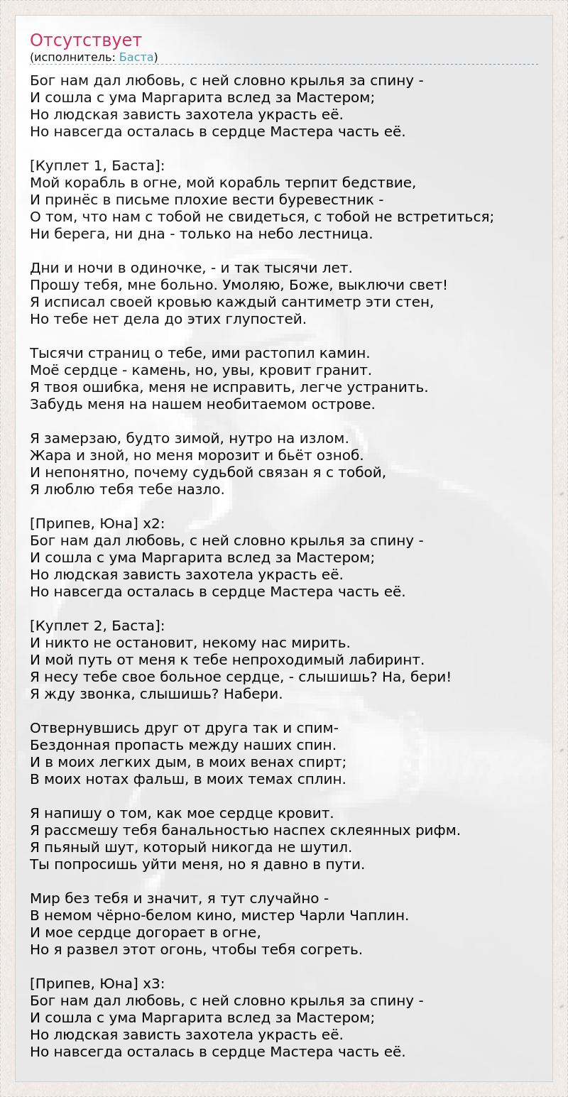 Бог нам дал любовь, с ней словно крылья за спину - И сошла с ума Маргарита вслед за Мастером; Но людская зависть захотела украсть её. Но навсегда осталась в сердце Мастера часть её. [Куплет 1, Баста]: Мой корабль в огне, мой корабль терпит бедствие, И принёс в письме плохие вести буревестник - О том, что нам с тобой не свидеться, с тобой не встретиться; Ни берега, ни дна - только на небо лестница. Дни и ночи в одиночке, - и так тысячи лет. Прошу тебя, мне больно. Умоляю, Боже, выключи свет! Я исписал своей кровью каждый сантиметр эти стен, Но тебе нет дела до этих глупостей. Тысячи страниц о тебе, ими растопил камин. Моё сердце - камень, но, увы, кровит гранит. Я твоя ошибка, меня не исправить, легче устранить. Забудь меня на нашем необитаемом острове. Я замерзаю, будто зимой, нутро на излом. Жара и зной, но меня морозит и бьёт озноб. И непонятно, почему судьбой связан я с тобой, Я люблю тебя тебе назло. [Припев, Юна] x2: Бог нам дал любовь, с ней словно крылья за спину - И сошла с ума Маргарита вслед за Мастером; Но людская зависть захотела украсть её. Но навсегда осталась в сердце Мастера часть её. [Куплет 2, Баста]: И никто не остановит, некому нас мирить. И мой путь от меня к тебе непроходимый лабиринт. Я несу тебе свое больное сердце, - слышишь? На, бери! Я жду звонка, слышишь? Набери. Отвернувшись друг от друга так и спим- Бездонная пропасть между наших спин. И в моих легких дым, в моих венах спирт; В моих нотах фальш, в моих темах сплин. Я напишу о том, как мое сердце кровит. Я рассмешу тебя банальностью наспех склеянных рифм. Я пьяный шут, который никогда не шутил. Ты попросишь уйти меня, но я давно в пути. Мир без тебя и значит, я тут случайно - В немом чёрно-белом кино, мистер Чарли Чаплин. И мое сердце догорает в огне, Но я развел этот огонь, чтобы тебя согреть. [Припев, Юна] x3: Бог нам дал любовь, с ней словно крылья за спину - И сошла с ума Маргарита вслед за Мастером; Но людская зависть захотела украсть её. Но навсегда осталась в сердце Мастера часть её.