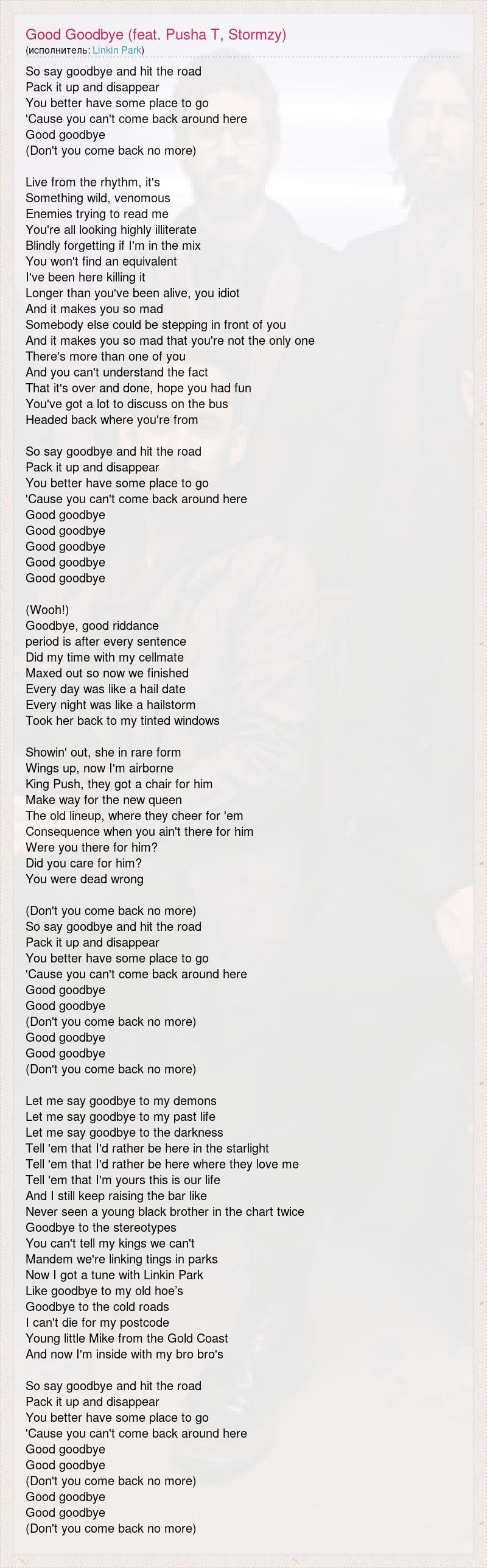So say goodbye and hit the road Pack it up and disappear You better have some place to go 'Cause you can't come back around here Good goodbye (Don't you come back no more) Live from the rhythm, it's Something wild, venomous Enemies trying to read me You're all looking highly illiterate Blindly forgetting if I'm in the mix You won't find an equivalent I've been here killing it Longer than you've been alive, you idiot And it makes you so mad Somebody else could be stepping in front of you And it makes you so mad that you're not the only one There's more than one of you And you can't understand the fact That it's over and done, hope you had fun You've got a lot to discuss on the bus Headed back where you're from So say goodbye and hit the road Pack it up and disappear You better have some place to go 'Cause you can't come back around here Good goodbye Good goodbye Good goodbye Good goodbye Good goodbye (Wooh!) Goodbye, good riddance period is after every sentence Did my time with my cellmate Maxed out so now we finished Every day was like a hail date Every night was like a hailstorm Took her back to my tinted windows Showin' out, she in rare form Wings up, now I'm airborne King Push, they got a chair for him Make way for the new queen The old lineup, where they cheer for 'em Consequence when you ain't there for him Were you there for him? Did you care for him? You were dead wrong (Don't you come back no more) So say goodbye and hit the road Pack it up and disappear You better have some place to go 'Cause you can't come back around here Good goodbye Good goodbye (Don't you come back no more) Good goodbye Good goodbye (Don't you come back no more) Let me say goodbye to my demons Let me say goodbye to my past life Let me say goodbye to the darkness Tell 'em that I'd rather be here in the starlight Tell 'em that I'd rather be here where they love me Tell 'em that I'm yours this is our life And I still keep raising the bar like Never seen a young black brother in the chart twice Goodbye to the stereotypes You can't tell my kings we can't Mandem we're linking tings in parks Now I got a tune with Linkin Park Like goodbye to my old hoe’s Goodbye to the cold roads I can't die for my postcode Young little Mike from the Gold Coast And now I'm inside with my bro bro's So say goodbye and hit the road Pack it up and disappear You better have some place to go 'Cause you can't come back around here Good goodbye Good goodbye (Don't you come back no more) Good goodbye Good goodbye (Don't you come back no more)