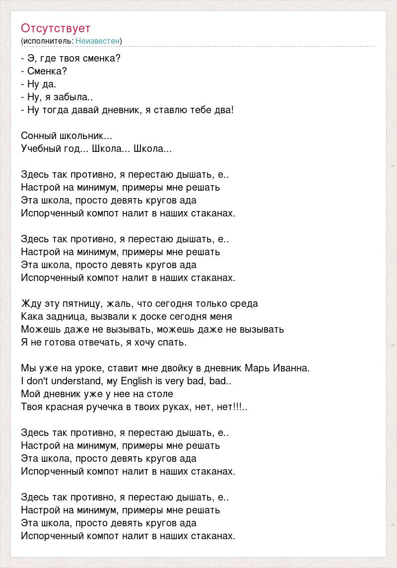 - Э, где твоя сменка? - Сменка? - Ну да. - Ну, я забыла.. - Ну тогда давай дневник, я ставлю тебе два! Сонный школьник... Учебный год... Школа... Школа... Здесь так противно, я перестаю дышать, е.. Настрой на минимум, примеры мне решать Эта школа, просто девять кругов ада Испорченный компот налит в наших стаканах. Здесь так противно, я перестаю дышать, е.. Настрой на минимум, примеры мне решать Эта школа, просто девять кругов ада Испорченный компот налит в наших стаканах. Жду эту пятницу, жаль, что сегодня только среда Кака задница, вызвали к доске сегодня меня Можешь даже не вызывать, можешь даже не вызывать Я не готова отвечать, я хочу спать. Мы уже на уроке, ставит мне двойку в дневник Марь Иванна. I don't understand, мy English is very bad, bad.. Мой дневник уже у нее на столе Твоя красная ручечка в твоих руках, нет, нет!!!.. Здесь так противно, я перестаю дышать, е.. Настрой на минимум, примеры мне решать Эта школа, просто девять кругов ада Испорченный компот налит в наших стаканах. Здесь так противно, я перестаю дышать, е.. Настрой на минимум, примеры мне решать Эта школа, просто девять кругов ада Испорченный компот налит в наших стаканах.