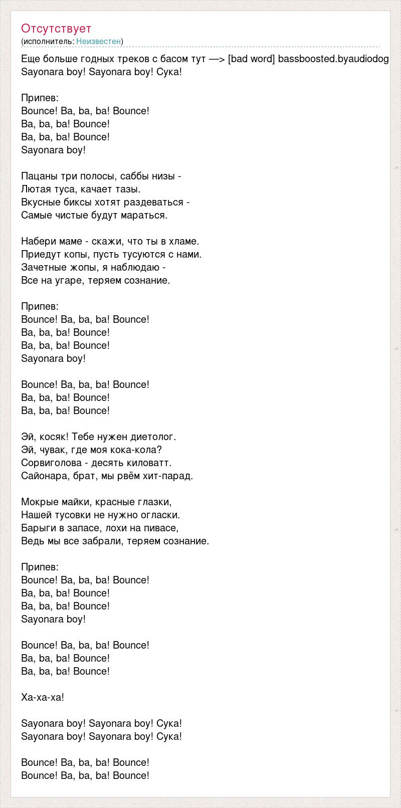 Еще больше годных треков с басом тут —> [bad word] bassboosted.byaudiodog Sayonara boy! Sayonara boy! Сука! Припев: Bounce! Ba, ba, ba! Bounce! Ba, ba, ba! Bounce! Ba, ba, ba! Bounce! Sayonara boy! Пацаны три полосы, саббы низы - Лютая туса, качает тазы. Вкусные биксы хотят раздеваться - Самые чистые будут мараться. Набери маме - скажи, что ты в хламе. Приедут копы, пусть тусуются с нами. Зачетные жопы, я наблюдаю - Все на угаре, теряем сознание. Припев: Bounce! Ba, ba, ba! Bounce! Ba, ba, ba! Bounce! Ba, ba, ba! Bounce! Sayonara boy! Bounce! Ba, ba, ba! Bounce! Ba, ba, ba! Bounce! Ba, ba, ba! Bounce! Эй, косяк! Тебе нужен диетолог. Эй, чувак, где моя кока-кола? Сорвиголова - десять киловатт. Сайонара, брат, мы рвём хит-парад. Мокрые майки, красные глазки, Нашей тусовки не нужно огласки. Барыги в запасе, лохи на пивасе, Ведь мы все забрали, теряем сознание. Припев: Bounce! Ba, ba, ba! Bounce! Ba, ba, ba! Bounce! Ba, ba, ba! Bounce! Sayonara boy! Bounce! Ba, ba, ba! Bounce! Ba, ba, ba! Bounce! Ba, ba, ba! Bounce! Ха-ха-ха! Sayonara boy! Sayonara boy! Сука! Sayonara boy! Sayonara boy! Сука! Bounce! Ba, ba, ba! Bounce! Bounce! Ba, ba, ba! Bounce!