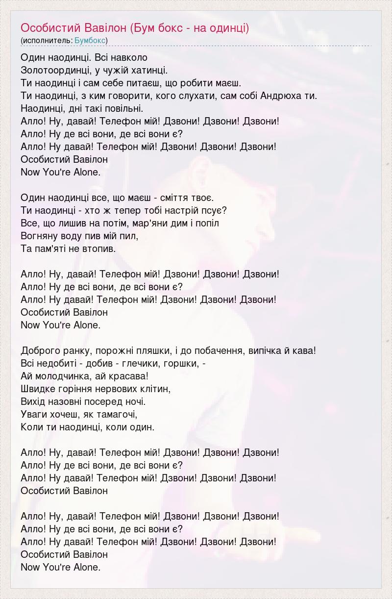 Один наодинці. Всі навколо Золотоординці, у чужій хатинці. Ти наодинці і сам себе питаєш, що робити маєш. Ти наодинці, з ким говорити, кого слухати, сам собі Андрюха ти. Наодинці, дні такі повільні. Алло! Ну, давай! Телефон мій! Дзвони! Дзвони! Дзвони! Алло! Ну де всі вони, де всі вони є? Алло! Ну давай! Телефон мiй! Дзвони! Дзвони! Дзвони! Особистий Вавілон Now You're Alone. Один наодинці все, що маєш - сміття твоє. Ти наодинці - хто ж тепер тобі настрій псує? Все, що лишив на потім, мар'яни дим i попiл Вогняну воду пив мій пил, Та пам'яті не втопив. Алло! Ну, давай! Телефон мій! Дзвони! Дзвони! Дзвони! Алло! Ну де всі вони, де всі вони є? Алло! Ну давай! Телефон мiй! Дзвони! Дзвони! Дзвони! Особистий Вавілон Now You're Alone. Доброго ранку, порожні пляшки, і до побачення, випічка й кава! Всі недобиті - добив - глечики, горшки, - Ай молодчинка, ай красава! Швидке горіння нервових клітин, Вихід назовні посеред ночі. Уваги хочеш, як тамагочі, Коли ти наодинці, коли один. Алло! Ну, давай! Телефон мій! Дзвони! Дзвони! Дзвони! Алло! Ну де всі вони, де всі вони є? Алло! Ну давай! Телефон мiй! Дзвони! Дзвони! Дзвони! Особистий Вавілон Алло! Ну, давай! Телефон мій! Дзвони! Дзвони! Дзвони! Алло! Ну де всі вони, де всі вони є? Алло! Ну давай! Телефон мiй! Дзвони! Дзвони! Дзвони! Особистий Вавілон Now You're Alone.