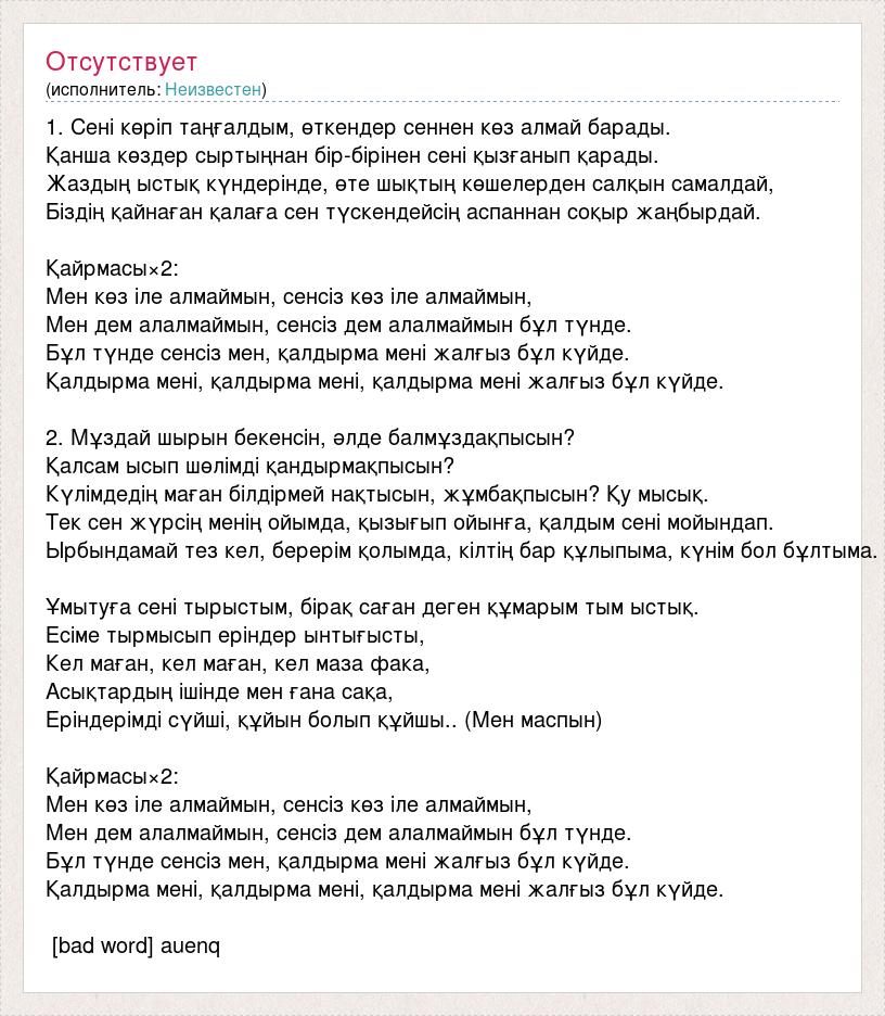 1. Сені көріп таңғалдым, өткендер сеннен көз алмай барады. Қанша көздер сыртыңнан бір-бірінен сені қызғанып қарады. Жаздың ыстық күндерінде, өте шықтың көшелерден салқын самалдай, Біздің қайнаған қалаға сен түскендейсің аспаннан соқыр жаңбырдай. Қайрмасы×2: Мен көз іле алмаймын, сенсіз көз іле алмаймын, Мен дем алалмаймын, сенсіз дем алалмаймын бұл түнде. Бұл түнде сенсіз мен, қалдырма мені жалғыз бұл күйде. Қалдырма мені, қалдырма мені, қалдырма мені жалғыз бұл күйде. 2. Мұздай шырын бекенсін, әлде балмұздақпысын? Қалсам ысып шөлімді қандырмақпысын? Күлімдедің маған білдірмей нақтысын, жұмбақпысын? Қу мысық. Тек сен жүрсің менің ойымда, қызығып ойынға, қалдым сені мойындап. Ырбындамай тез кел, берерім қолымда, кілтің бар құлыпыма, күнім бол бұлтыма. Ұмытуға сені тырыстым, бірақ саған деген құмарым тым ыстық. Есіме тырмысып еріндер ынтығысты, Кел маған, кел маған, кел маза фака, Асықтардың ішінде мен ғана сақа, Еріндерімді сүйші, құйын болып құйшы.. (Мен маспын) Қайрмасы×2: Мен көз іле алмаймын, сенсіз көз іле алмаймын, Мен дем алалмаймын, сенсіз дем алалмаймын бұл түнде. Бұл түнде сенсіз мен, қалдырма мені жалғыз бұл күйде. Қалдырма мені, қалдырма мені, қалдырма мені жалғыз бұл күйде. [bad word] auenq