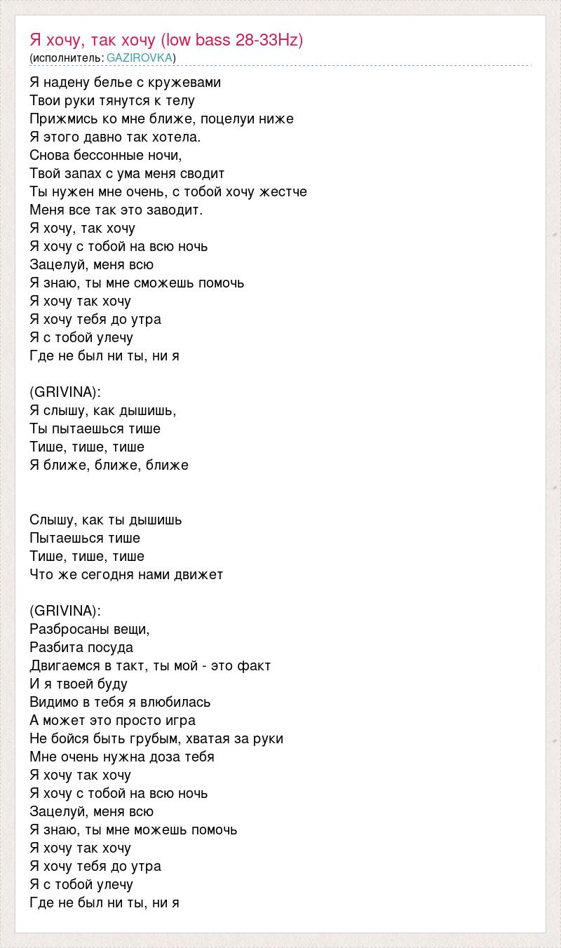 Я надену белье с кружевами Твои руки тянутся к телу Прижмись ко мне ближе, поцелуи ниже Я этого давно так хотела. Снова бессонные ночи, Твой запах с ума меня сводит Ты нужен мне очень, с тобой хочу жестче Меня все так это заводит. Я хочу, так хочу Я хочу с тобой на всю ночь Зацелуй, меня всю Я знаю, ты мне сможешь помочь Я хочу так хочу Я хочу тебя до утра Я с тобой улечу Где не был ни ты, ни я (GRIVINA): Я слышу, как дышишь, Ты пытаешься тише Тише, тише, тише Я ближе, ближе, ближе Слышу, как ты дышишь Пытаешься тише Тише, тише, тише Что же сегодня нами движет (GRIVINA): Разбросаны вещи, Разбита посуда Двигаемся в такт, ты мой - это факт И я твоей буду Видимо в тебя я влюбилась А может это просто игра Не бойся быть грубым, хватая за руки Мне очень нужна доза тебя Я хочу так хочу Я хочу с тобой на всю ночь Зацелуй, меня всю Я знаю, ты мне можешь помочь Я хочу так хочу Я хочу тебя до утра Я с тобой улечу Где не был ни ты, ни я