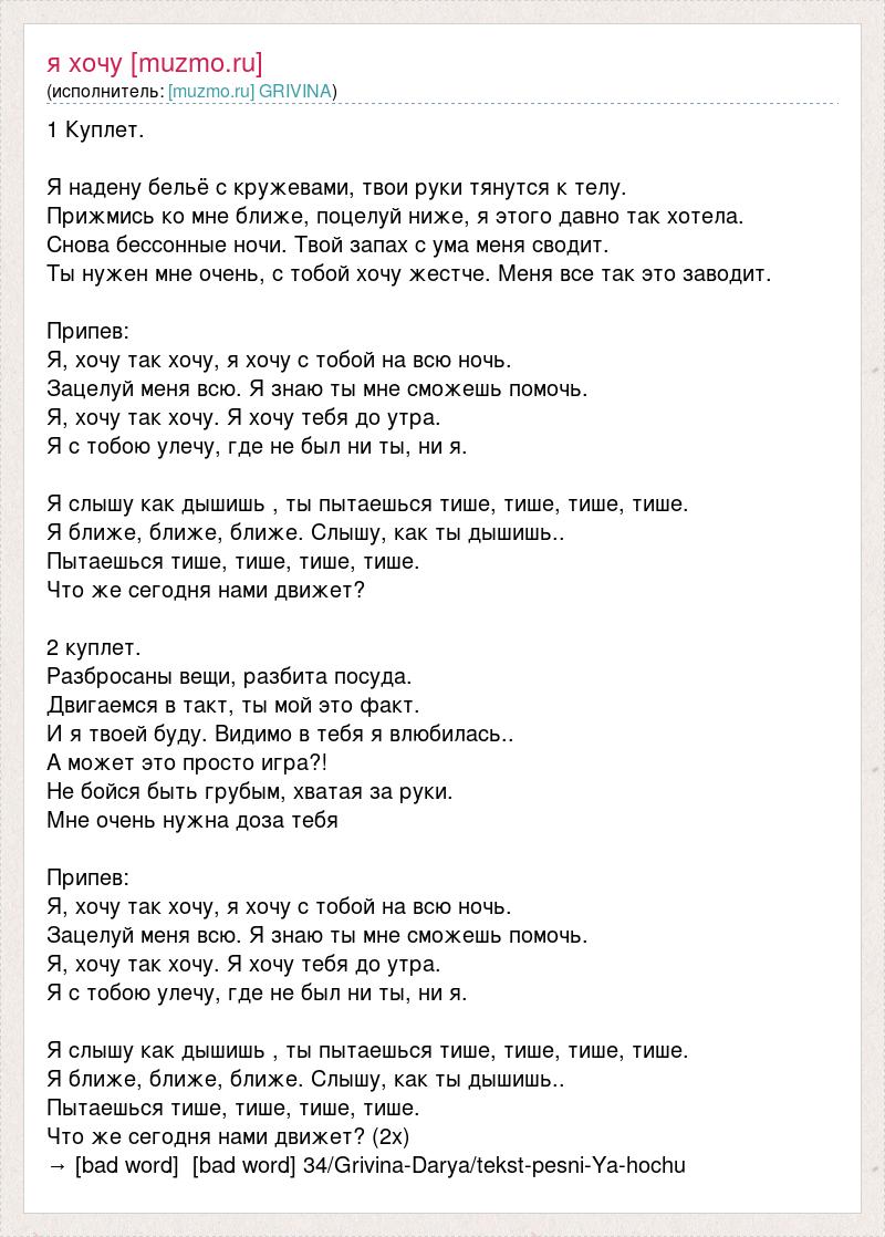 1 Куплет. Я надену бельё с кружевами, твои руки тянутся к телу. Прижмись ко мне ближе, поцелуй ниже, я этого давно так хотела. Снова бессонные ночи. Твой запах с ума меня сводит. Ты нужен мне очень, с тобой хочу жестче. Меня все так это заводит. Припев: Я, хочу так хочу, я хочу с тобой на всю ночь. Зацелуй меня всю. Я знаю ты мне сможешь помочь. Я, хочу так хочу. Я хочу тебя до утра. Я с тобою улечу, где не был ни ты, ни я. Я слышу как дышишь , ты пытаешься тише, тише, тише, тише. Я ближе, ближе, ближе. Слышу, как ты дышишь.. Пытаешься тише, тише, тише, тише. Что же сегодня нами движет? 2 куплет. Разбросаны вещи, разбита посуда. Двигаемся в такт, ты мой это факт. И я твоей буду. Видимо в тебя я влюбилась.. А может это просто игра?! Не бойся быть грубым, хватая за руки. Мне очень нужна доза тебя Припев: Я, хочу так хочу, я хочу с тобой на всю ночь. Зацелуй меня всю. Я знаю ты мне сможешь помочь. Я, хочу так хочу. Я хочу тебя до утра. Я с тобою улечу, где не был ни ты, ни я. Я слышу как дышишь , ты пытаешься тише, тише, тише, тише. Я ближе, ближе, ближе. Слышу, как ты дышишь.. Пытаешься тише, тише, тише, тише. Что же сегодня нами движет? (2х) → [bad word] [bad word] 34/Grivina-Darya/tekst-pesni-Ya-hochu