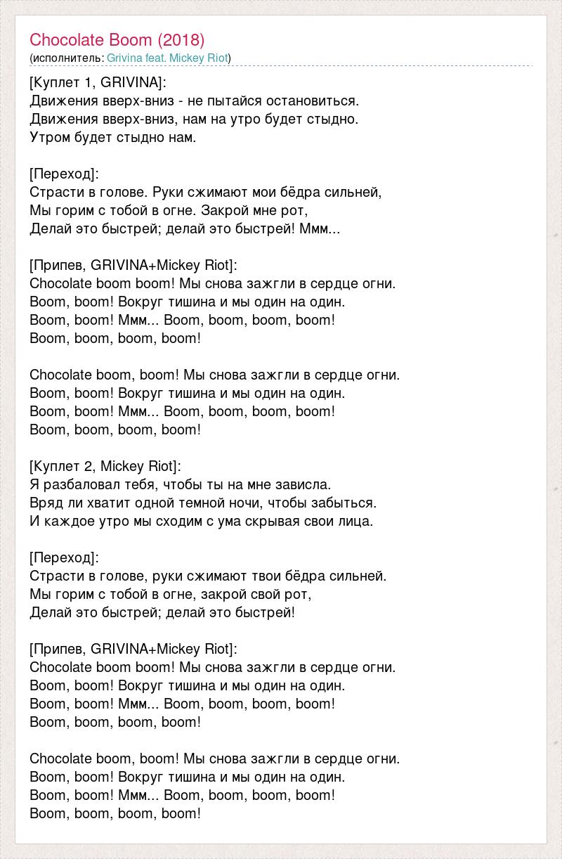 [Куплет 1, GRIVINA]: Движения вверх-вниз - не пытайся остановиться. Движения вверх-вниз, нам на утро будет стыдно. Утром будет стыдно нам. [Переход]: Страсти в голове. Руки сжимают мои бёдра сильней, Мы горим с тобой в огне. Закрой мне рот, Делай это быстрей; делай это быстрей! Ммм... [Припев, GRIVINA+Mickey Riot]: Chocolate boom boom! Мы снова зажгли в сердце огни. Boom, boom! Вокруг тишина и мы один на один. Boom, boom! Ммм... Boom, boom, boom, boom! Boom, boom, boom, boom! Chocolate boom, boom! Мы снова зажгли в сердце огни. Boom, boom! Вокруг тишина и мы один на один. Boom, boom! Ммм... Boom, boom, boom, boom! Boom, boom, boom, boom! [Куплет 2, Mickey Riot]: Я разбаловал тебя, чтобы ты на мне зависла. Вряд ли хватит одной темной ночи, чтобы забыться. И каждое утро мы сходим с ума скрывая свои лица. [Переход]: Страсти в голове, руки сжимают твои бёдра сильней. Мы горим с тобой в огне, закрой свой рот, Делай это быстрей; делай это быстрей! [Припев, GRIVINA+Mickey Riot]: Chocolate boom boom! Мы снова зажгли в сердце огни. Boom, boom! Вокруг тишина и мы один на один. Boom, boom! Ммм... Boom, boom, boom, boom! Boom, boom, boom, boom! Chocolate boom, boom! Мы снова зажгли в сердце огни. Boom, boom! Вокруг тишина и мы один на один. Boom, boom! Ммм... Boom, boom, boom, boom! Boom, boom, boom, boom!