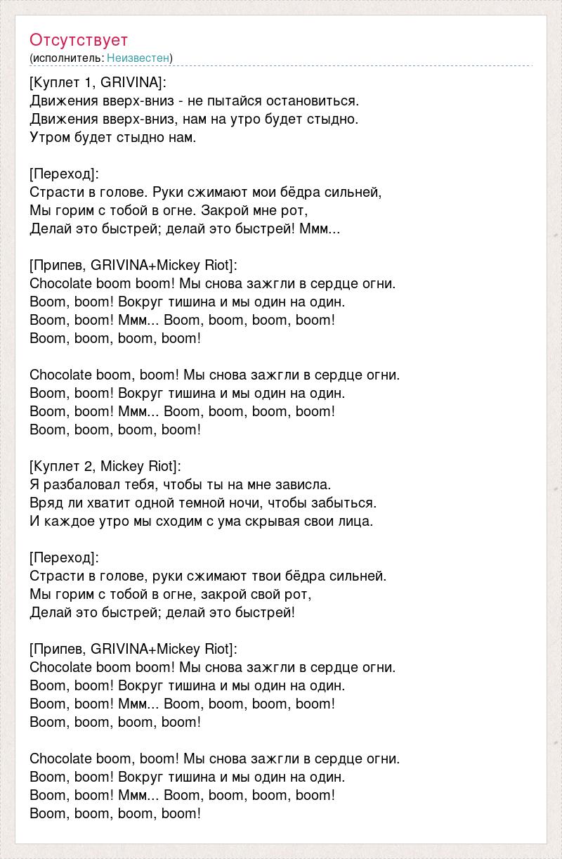 [Куплет 1, GRIVINA]: Движения вверх-вниз - не пытайся остановиться. Движения вверх-вниз, нам на утро будет стыдно. Утром будет стыдно нам. [Переход]: Страсти в голове. Руки сжимают мои бёдра сильней, Мы горим с тобой в огне. Закрой мне рот, Делай это быстрей; делай это быстрей! Ммм... [Припев, GRIVINA+Mickey Riot]: Chocolate boom boom! Мы снова зажгли в сердце огни. Boom, boom! Вокруг тишина и мы один на один. Boom, boom! Ммм... Boom, boom, boom, boom! Boom, boom, boom, boom! Chocolate boom, boom! Мы снова зажгли в сердце огни. Boom, boom! Вокруг тишина и мы один на один. Boom, boom! Ммм... Boom, boom, boom, boom! Boom, boom, boom, boom! [Куплет 2, Mickey Riot]: Я разбаловал тебя, чтобы ты на мне зависла. Вряд ли хватит одной темной ночи, чтобы забыться. И каждое утро мы сходим с ума скрывая свои лица. [Переход]: Страсти в голове, руки сжимают твои бёдра сильней. Мы горим с тобой в огне, закрой свой рот, Делай это быстрей; делай это быстрей! [Припев, GRIVINA+Mickey Riot]: Chocolate boom boom! Мы снова зажгли в сердце огни. Boom, boom! Вокруг тишина и мы один на один. Boom, boom! Ммм... Boom, boom, boom, boom! Boom, boom, boom, boom! Chocolate boom, boom! Мы снова зажгли в сердце огни. Boom, boom! Вокруг тишина и мы один на один. Boom, boom! Ммм... Boom, boom, boom, boom! Boom, boom, boom, boom!