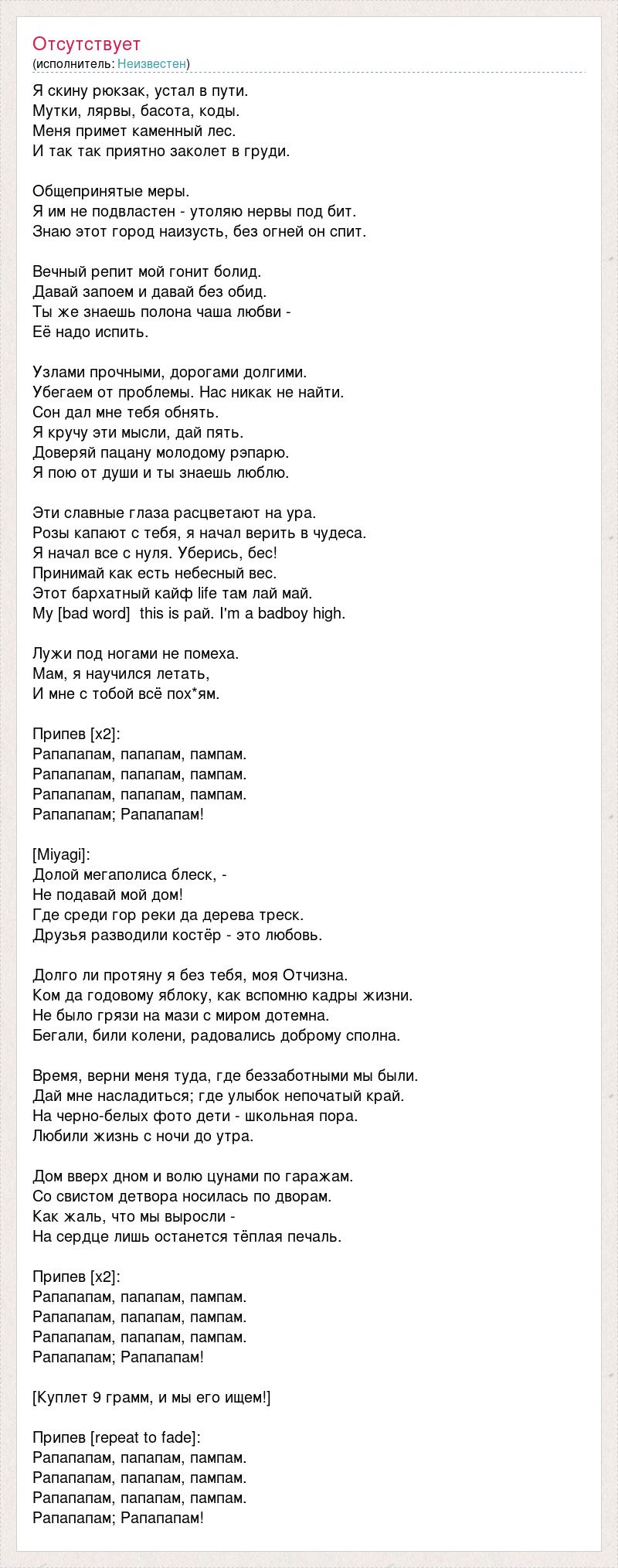 Я скину рюкзак, устал в пути. Мутки, лярвы, басота, коды. Меня примет каменный лес. И так так приятно заколет в груди. Общепринятые меры. Я им не подвластен - утоляю нервы под бит. Знаю этот город наизусть, без огней он спит. Вечный репит мой гонит болид. Давай запоем и давай без обид. Ты же знаешь полона чаша любви - Её надо испить. Узлами прочными, дорогами долгими. Убегаем от проблемы. Нас никак не найти. Сон дал мне тебя обнять. Я кручу эти мысли, дай пять. Доверяй пацану молодому рэпарю. Я пою от души и ты знаешь люблю. Эти славные глаза расцветают на ура. Розы капают с тебя, я начал верить в чудеса. Я начал все с нуля. Уберись, бес! Принимай как есть небесный вес. Этот бархатный кайф life там лай май. My [bad word] this is рай. I'm a badboy high. Лужи под ногами не помеха. Мам, я научился летать, И мне с тобой всё пох*ям. Припев [x2]: Рапапапам, папапам, пампам. Рапапапам, папапам, пампам. Рапапапам, папапам, пампам. Рапапапам; Рапапапам! [Miyagi]: Долой мегаполиса блеск, - Не подавай мой дом! Где среди гор реки да дерева треск. Друзья разводили костёр - это любовь. Долго ли протяну я без тебя, моя Отчизна. Ком да годовому яблоку, как вспомню кадры жизни. Не было грязи на мази с миром дотемна. Бегали, били колени, радовались доброму сполна. Время, верни меня туда, где беззаботными мы были. Дай мне насладиться; где улыбок непочатый край. На черно-белых фото дети - школьная пора. Любили жизнь с ночи до утра. Дом вверх дном и волю цунами по гаражам. Со свистом детвора носилась по дворам. Как жаль, что мы выросли - На сердце лишь останется тёплая печаль. Припев [x2]: Рапапапам, папапам, пампам. Рапапапам, папапам, пампам. Рапапапам, папапам, пампам. Рапапапам; Рапапапам! [Куплет 9 грамм, и мы его ищем!] Припев [repeat to fade]: Рапапапам, папапам, пампам. Рапапапам, папапам, пампам. Рапапапам, папапам, пампам. Рапапапам; Рапапапам!