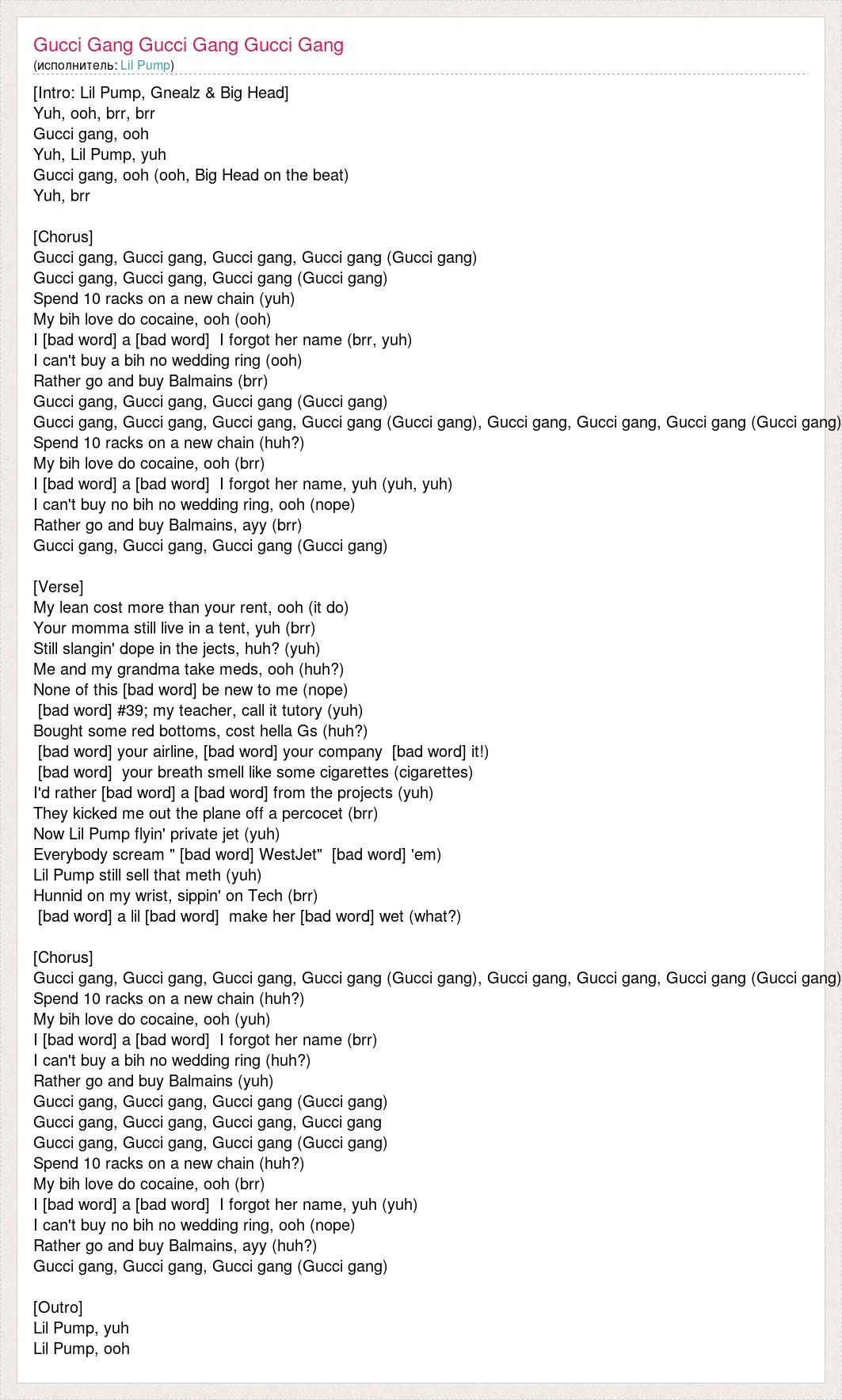 [Intro: Lil Pump, Gnealz & Big Head] Yuh, ooh, brr, brr Gucci gang, ooh Yuh, Lil Pump, yuh Gucci gang, ooh (ooh, Big Head on the beat) Yuh, brr [Chorus] Gucci gang, Gucci gang, Gucci gang, Gucci gang (Gucci gang) Gucci gang, Gucci gang, Gucci gang (Gucci gang) Spend 10 racks on a new chain (yuh) My bih love do cocaine, ooh (ooh) I [bad word] a [bad word] I forgot her name (brr, yuh) I can't buy a bih no wedding ring (ooh) Rather go and buy Balmains (brr) Gucci gang, Gucci gang, Gucci gang (Gucci gang) Gucci gang, Gucci gang, Gucci gang, Gucci gang (Gucci gang), Gucci gang, Gucci gang, Gucci gang (Gucci gang) Spend 10 racks on a new chain (huh?) My bih love do cocaine, ooh (brr) I [bad word] a [bad word] I forgot her name, yuh (yuh, yuh) I can't buy no bih no wedding ring, ooh (nope) Rather go and buy Balmains, ayy (brr) Gucci gang, Gucci gang, Gucci gang (Gucci gang) [Verse] My lean cost more than your rent, ooh (it do) Your momma still live in a tent, yuh (brr) Still slangin' dope in the jects, huh? (yuh) Me and my grandma take meds, ooh (huh?) None of this [bad word] be new to me (nope) [bad word] #39; my teacher, call it tutory (yuh) Bought some red bottoms, cost hella Gs (huh?) [bad word] your airline, [bad word] your company [bad word] it!) [bad word] your breath smell like some cigarettes (cigarettes) I'd rather [bad word] a [bad word] from the projects (yuh) They kicked me out the plane off a percocet (brr) Now Lil Pump flyin' private jet (yuh) Everybody scream " [bad word] WestJet" [bad word] 'em) Lil Pump still sell that meth (yuh) Hunnid on my wrist, sippin' on Tech (brr) [bad word] a lil [bad word] make her [bad word] wet (what?) [Chorus] Gucci gang, Gucci gang, Gucci gang, Gucci gang (Gucci gang), Gucci gang, Gucci gang, Gucci gang (Gucci gang) Spend 10 racks on a new chain (huh?) My bih love do cocaine, ooh (yuh) I [bad word] a [bad word] I forgot her name (brr) I can't buy a bih no wedding ring (huh?) Rather go and buy Balmains (yuh) Gucci gang, Gucci gang, Gucci gang (Gucci gang) Gucci gang, Gucci gang, Gucci gang, Gucci gang Gucci gang, Gucci gang, Gucci gang (Gucci gang) Spend 10 racks on a new chain (huh?) My bih love do cocaine, ooh (brr) I [bad word] a [bad word] I forgot her name, yuh (yuh) I can't buy no bih no wedding ring, ooh (nope) Rather go and buy Balmains, ayy (huh?) Gucci gang, Gucci gang, Gucci gang (Gucci gang) [Outro] Lil Pump, yuh Lil Pump, ooh
