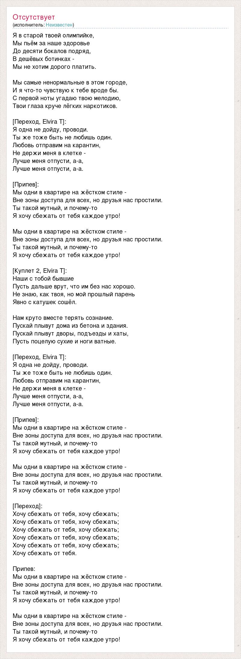 Я в старой твоей олимпийке, Мы пьём за наше здоровье До десяти бокалов подряд, В дешёвых ботинках - Мы не хотим дорого платить. Мы самые ненормальные в этом городе, И я что-то чувствую к тебе вроде бы. С первой ноты угадаю твою мелодию, Твои глаза круче лёгких наркотиков. [Переход, Elvira T]: Я одна не дойду, проводи. Ты же тоже быть не любишь один. Любовь отправим на карантин, Не держи меня в клетке - Лучше меня отпусти, а-а, Лучше меня отпусти, а-а. [Припев]: Мы одни в квартире на жёстком стиле - Вне зоны доступа для всех, но друзья нас простили. Ты такой мутный, и почему-то Я хочу сбежать от тебя каждое утро! Мы одни в квартире на жёстком стиле - Вне зоны доступа для всех, но друзья нас простили. Ты такой мутный, и почему-то Я хочу сбежать от тебя каждое утро! [Куплет 2, Elvira T]: Наши с тобой бывшие Пусть дальше врут, что им без нас хорошо. Не знаю, как твоя, но мой прошлый парень Явно с катушек сошёл. Нам круто вместе терять сознание. Пускай плывут дома из бетона и здания. Пускай плывут дворы, подъезды и хаты, Пусть поцелую сухие и ноги ватные. [Переход, Elvira T]: Я одна не дойду, проводи. Ты же тоже быть не любишь один. Любовь отправим на карантин, Не держи меня в клетке - Лучше меня отпусти, а-а, Лучше меня отпусти, а-а. [Припев]: Мы одни в квартире на жёстком стиле - Вне зоны доступа для всех, но друзья нас простили. Ты такой мутный, и почему-то Я хочу сбежать от тебя каждое утро! Мы одни в квартире на жёстком стиле - Вне зоны доступа для всех, но друзья нас простили. Ты такой мутный, и почему-то Я хочу сбежать от тебя каждое утро! [Переход]: Хочу сбежать от тебя, хочу сбежать; Хочу сбежать от тебя, хочу сбежать; Хочу сбежать от тебя, хочу сбежать; Хочу сбежать от тебя, хочу сбежать; Хочу сбежать от тебя, хочу сбежать; Хочу сбежать от тебя. Припев: Мы одни в квартире на жёстком стиле - Вне зоны доступа для всех, но друзья нас простили. Ты такой мутный, и почему-то Я хочу сбежать от тебя каждое утро! Мы одни в квартире на жёстком стиле - Вне зоны доступа для всех, но друзья нас простили. Ты такой мутный, и почему-то Я хочу сбежать от тебя каждое утро!