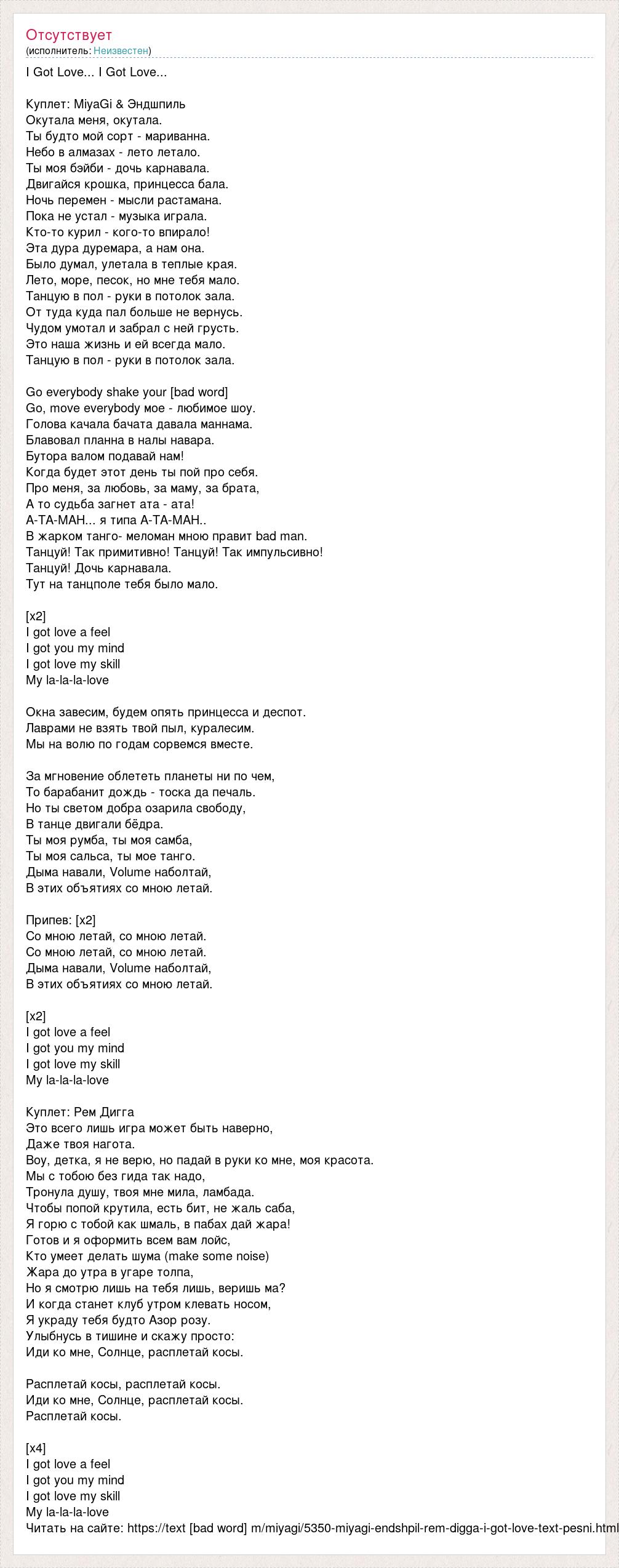 I Got Love... I Got Love... Куплет: MiyaGi & Эндшпиль Окутала меня, окутала. Ты будто мой сорт - мариванна. Небо в алмазах - лето летало. Ты моя бэйби - дочь карнавала. Двигайся крошка, принцесса бала. Ночь перемен - мысли растамана. Пока не устал - музыка играла. Кто-то курил - кого-то впирало! Эта дура дуремара, а нам она. Было думал, улетала в теплые края. Лето, море, песок, но мне тебя мало. Танцую в пол - руки в потолок зала. От туда куда пал больше не вернусь. Чудом умотал и забрал с ней грусть. Это наша жизнь и ей всегда мало. Танцую в пол - руки в потолок зала. Go everybody shake your [bad word] Go, move everybody мое - любимое шоу. Голова качала бачата давала маннама. Блавовал планна в налы навара. Бутора валом подавай нам! Когда будет этот день ты пой про себя. Про меня, за любовь, за маму, за брата, А то судьба загнет ата - ата! А-ТА-МАН... я типа А-ТА-МАН.. В жарком танго- меломан мною правит bad man. Танцуй! Так примитивно! Танцуй! Так импульсивно! Танцуй! Дочь карнавала. Тут на танцполе тебя было мало. [x2] I got love a feel I got you my mind I got love my skill My la-la-la-love Окна завесим, будем опять принцесса и деспот. Лаврами не взять твой пыл, куралесим. Мы на волю по годам сорвемся вместе. За мгновение облететь планеты ни по чем, То барабанит дождь - тоска да печаль. Но ты светом добра озарила свободу, В танце двигали бёдра. Ты моя румба, ты моя самба, Ты моя сальса, ты мое танго. Дыма навали, Volume наболтай, В этих объятиях со мною летай. Припев: [х2] Со мною летай, со мною летай. Со мною летай, со мною летай. Дыма навали, Volume наболтай, В этих объятиях со мною летай. [х2] I got love a feel I got you my mind I got love my skill My la-la-la-love Куплет: Рем Дигга Это всего лишь игра может быть наверно, Даже твоя нагота. Воу, детка, я не верю, но падай в руки ко мне, моя красота. Мы с тобою без гида так надо, Тронула душу, твоя мне мила, ламбада. Чтобы попой крутила, есть бит, не жаль саба, Я горю с тобой как шмаль, в пабах дай жара! Готов и я оформить всем вам лойс, Кто умеет делать шума (make some noise) Жара до утра в угаре толпа, Но я смотрю лишь на тебя лишь, веришь ма? И когда станет клуб утром клевать носом, Я украду тебя будто Азор розу. Улыбнусь в тишине и скажу просто: Иди ко мне, Солнце, расплетай косы. Расплетай косы, расплетай косы. Иди ко мне, Солнце, расплетай косы. Расплетай косы. [x4] I got love a feel I got you my mind I got love my skill My la-la-la-love Читать на сайте: https://text [bad word] m/miyagi/5350-miyagi-endshpil-rem-digga-i-got-love-text-pesni.html