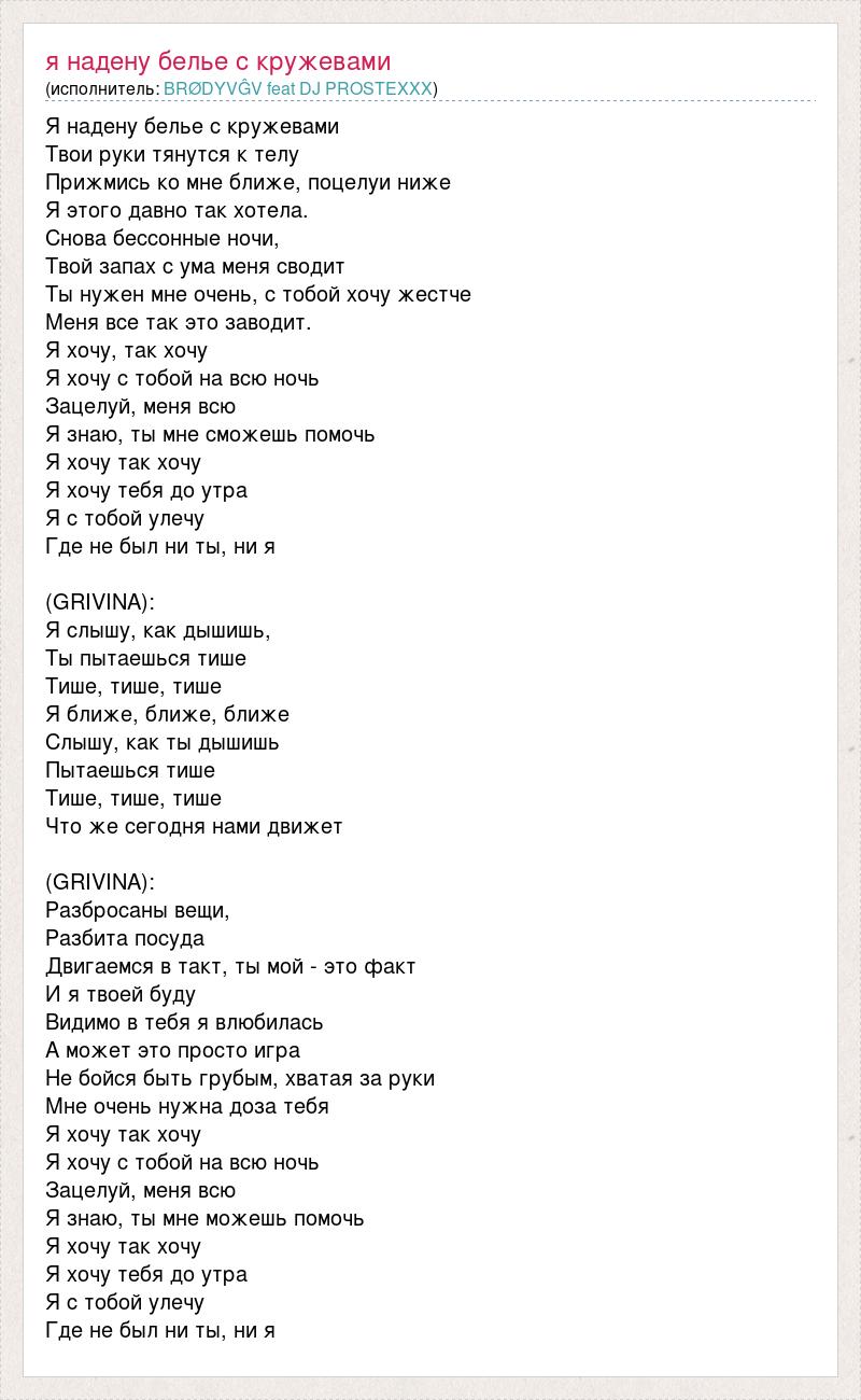 Я надену белье с кружевами Твои руки тянутся к телу Прижмись ко мне ближе, поцелуи ниже Я этого давно так хотела. Снова бессонные ночи, Твой запах с ума меня сводит Ты нужен мне очень, с тобой хочу жестче Меня все так это заводит. Я хочу, так хочу Я хочу с тобой на всю ночь Зацелуй, меня всю Я знаю, ты мне сможешь помочь Я хочу так хочу Я хочу тебя до утра Я с тобой улечу Где не был ни ты, ни я (GRIVINA): Я слышу, как дышишь, Ты пытаешься тише Тише, тише, тише Я ближе, ближе, ближе Слышу, как ты дышишь Пытаешься тише Тише, тише, тише Что же сегодня нами движет (GRIVINA): Разбросаны вещи, Разбита посуда Двигаемся в такт, ты мой - это факт И я твоей буду Видимо в тебя я влюбилась А может это просто игра Не бойся быть грубым, хватая за руки Мне очень нужна доза тебя Я хочу так хочу Я хочу с тобой на всю ночь Зацелуй, меня всю Я знаю, ты мне можешь помочь Я хочу так хочу Я хочу тебя до утра Я с тобой улечу Где не был ни ты, ни я