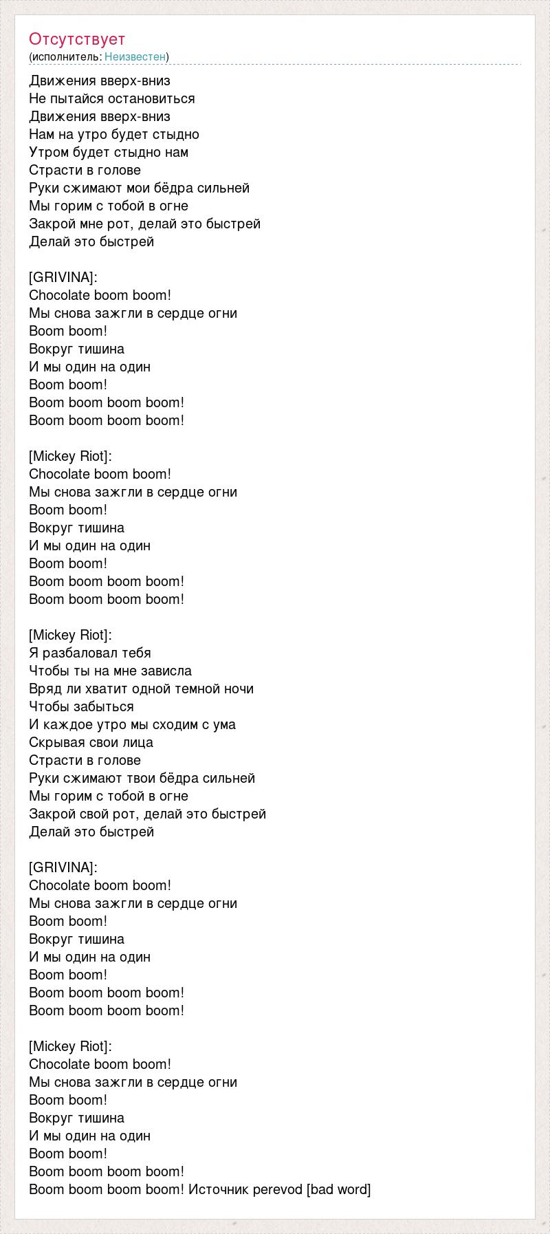 Движения вверх-вниз Не пытайся остановиться Движения вверх-вниз Нам на утро будет стыдно Утром будет стыдно нам Страсти в голове Руки сжимают мои бёдра сильней Мы горим с тобой в огне Закрой мне рот, делай это быстрей Делай это быстрей [GRIVINA]: Chocolate boom boom! Мы снова зажгли в сердце огни Boom boom! Вокруг тишина И мы один на один Boom boom! Boom boom boom boom! Boom boom boom boom! [Mickey Riot]: Chocolate boom boom! Мы снова зажгли в сердце огни Boom boom! Вокруг тишина И мы один на один Boom boom! Boom boom boom boom! Boom boom boom boom! [Mickey Riot]: Я разбаловал тебя Чтобы ты на мне зависла Вряд ли хватит одной темной ночи Чтобы забыться И каждое утро мы сходим с ума Скрывая свои лица Страсти в голове Руки сжимают твои бёдра сильней Мы горим с тобой в огне Закрой свой рот, делай это быстрей Делай это быстрей [GRIVINA]: Chocolate boom boom! Мы снова зажгли в сердце огни Boom boom! Вокруг тишина И мы один на один Boom boom! Boom boom boom boom! Boom boom boom boom! [Mickey Riot]: Chocolate boom boom! Мы снова зажгли в сердце огни Boom boom! Вокруг тишина И мы один на один Boom boom! Boom boom boom boom! Boom boom boom boom! Источник perevod [bad word]