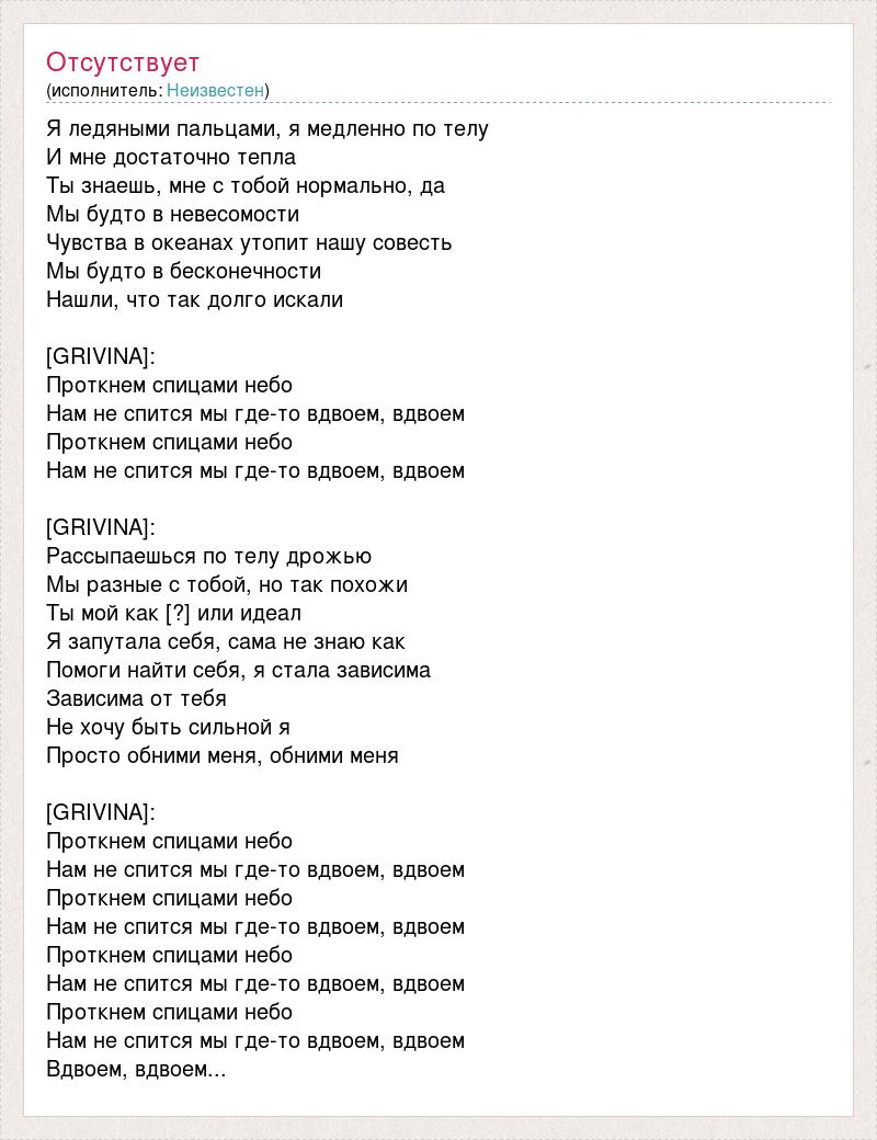 Я ледяными пальцами, я медленно по телу И мне достаточно тепла Ты знаешь, мне с тобой нормально, да Мы будто в невесомости Чувства в океанах утопит нашу совесть Мы будто в бесконечности Нашли, что так долго искали [GRIVINA]: Проткнем спицами небо Нам не спится мы где-то вдвоем, вдвоем Проткнем спицами небо Нам не спится мы где-то вдвоем, вдвоем [GRIVINA]: Рассыпаешься по телу дрожью Мы разные с тобой, но так похожи Ты мой как [?] или идеал Я запутала себя, сама не знаю как Помоги найти себя, я стала зависима Зависима от тебя Не хочу быть сильной я Просто обними меня, обними меня [GRIVINA]: Проткнем спицами небо Нам не спится мы где-то вдвоем, вдвоем Проткнем спицами небо Нам не спится мы где-то вдвоем, вдвоем Проткнем спицами небо Нам не спится мы где-то вдвоем, вдвоем Проткнем спицами небо Нам не спится мы где-то вдвоем, вдвоем Вдвоем, вдвоем...