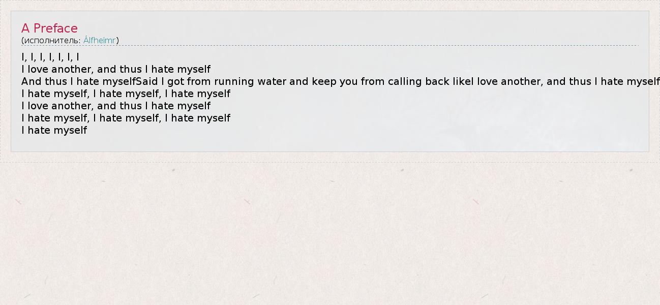 I, I, I, I, I, I, I I love another, and thus I hate myself And thus I hate myselfSaid I got from running water and keep you from calling back likeI love another, and thus I hate myself I hate myself, I hate myself, I hate myself I love another, and thus I hate myself I hate myself, I hate myself, I hate myself I hate myself