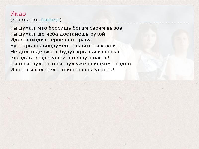 Это интересно:Рок-группа "Аквариус" была образована Алексом Аквариусом в Москве (Россия) в 2008 году. Аквариус (от лат. Aquarius - Водолей) - это эзотерическое имя новой эры, в которую вступило человечество в третьем тысячелетии. Это эра истинного знания и духовного возрождения. Вторя названию, творчество группы "Аквариус" наполнено тайнами и скрытым духовным смыслом. Тяжёлая и атмосферная музыка... продолжение