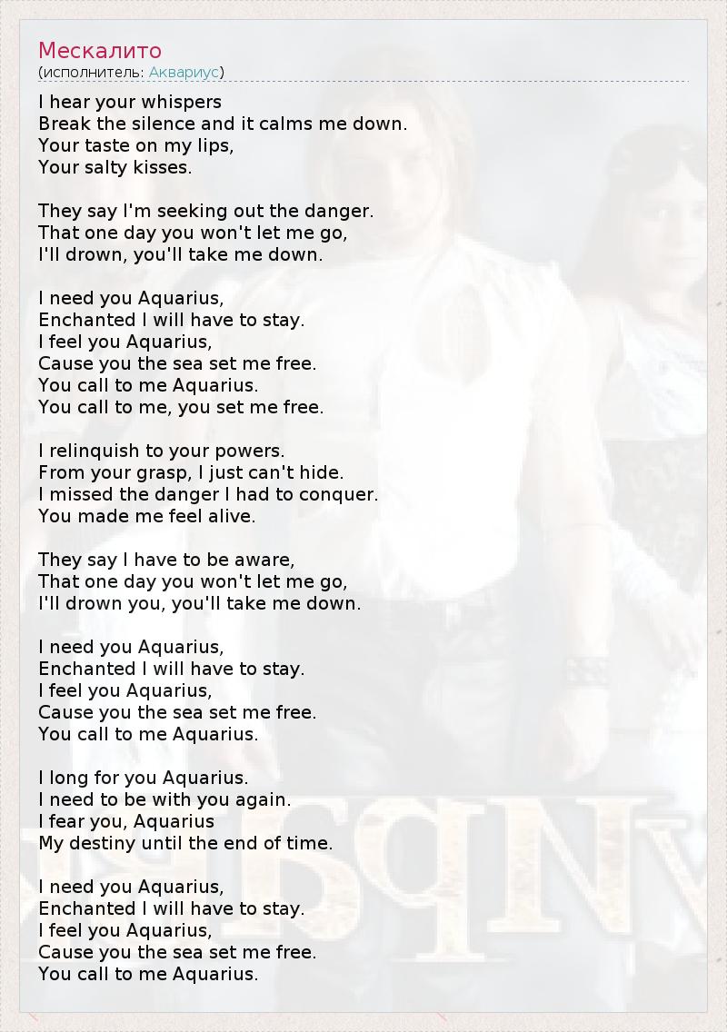 Я слышу твой шепот, Нарушающий тишину и приносящий мне покой, Твой вкус на моих губах, Твои соленые поцелуи. Они твердят, что я ищу опасность, Что однажды ты меня не отпустишь, Я стану тонуть, и ты потянешь меня вниз. Ты нужен мне, Водолей, Очарованной тобой, мне придется остаться, Я чувствую тебя, Водолей, Море освободило меня ради тебя. Ты зовешь меня, Водолей, Взывая ко мне, ты меня освобождаешь. Я сдаюсь твоей власти, Не могу вырваться из твоих объятий, Я не замечаю опасности, которой должна противостоять, Благодаря тебе я чувствую себя живой. Они твердят, что я должна знать, Что однажды ты меня не отпустишь, Я стану топить тебя, и ты потянешь меня за собой. Ты нужен мне, Водолей, Очарованной тобой, мне придется остаться, Я чувствую тебя, Водолей, Море освободило меня ради тебя. Ты зовешь меня, Водолей. Я жажду тебя, Водолей, Я снова должна быть с тобой, Я боюсь тебя, Водолей, Ты моя судьба до конца времен. Ты нужен мне, Водолей, Очарованной тобой, мне придется остаться, Я чувствую тебя, Водолей, Море освободило меня ради тебя. Ты зовешь меня, Водолей.