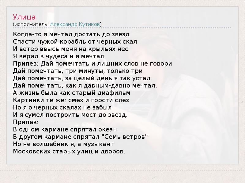 Это интересно:Александр Викторович Кутиков (13 апреля 1952, Москва) — композитор,бас-гитарист, вокалист. Заслуженный артист России. В группе «Машина времени» в 1971—1974 годах и с 1979-го до настоящего времени. Кутиков родился 13 апреля 1952 года в Москве, был сыном футболиста «Спартака», его детство прошло в Малом Пионерском переулке на Патриарших прудах. В юности занимался боксом. В «Машину времени» в 1971... продолжение