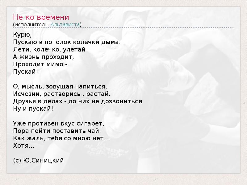 smoke , Let them smoke rings at the ceiling . Fly, ring , Flee And life goes , It passes by - Let them ! Oh, the thought of calling a drink , Disappear , solutions, melts. Friends affaires - to reach them Well, let them ! Already disgusted with the taste of cigarettes , It's time to put the tea. What a pity you do not have with me ... Although… ( c) Yu.Sinitsky