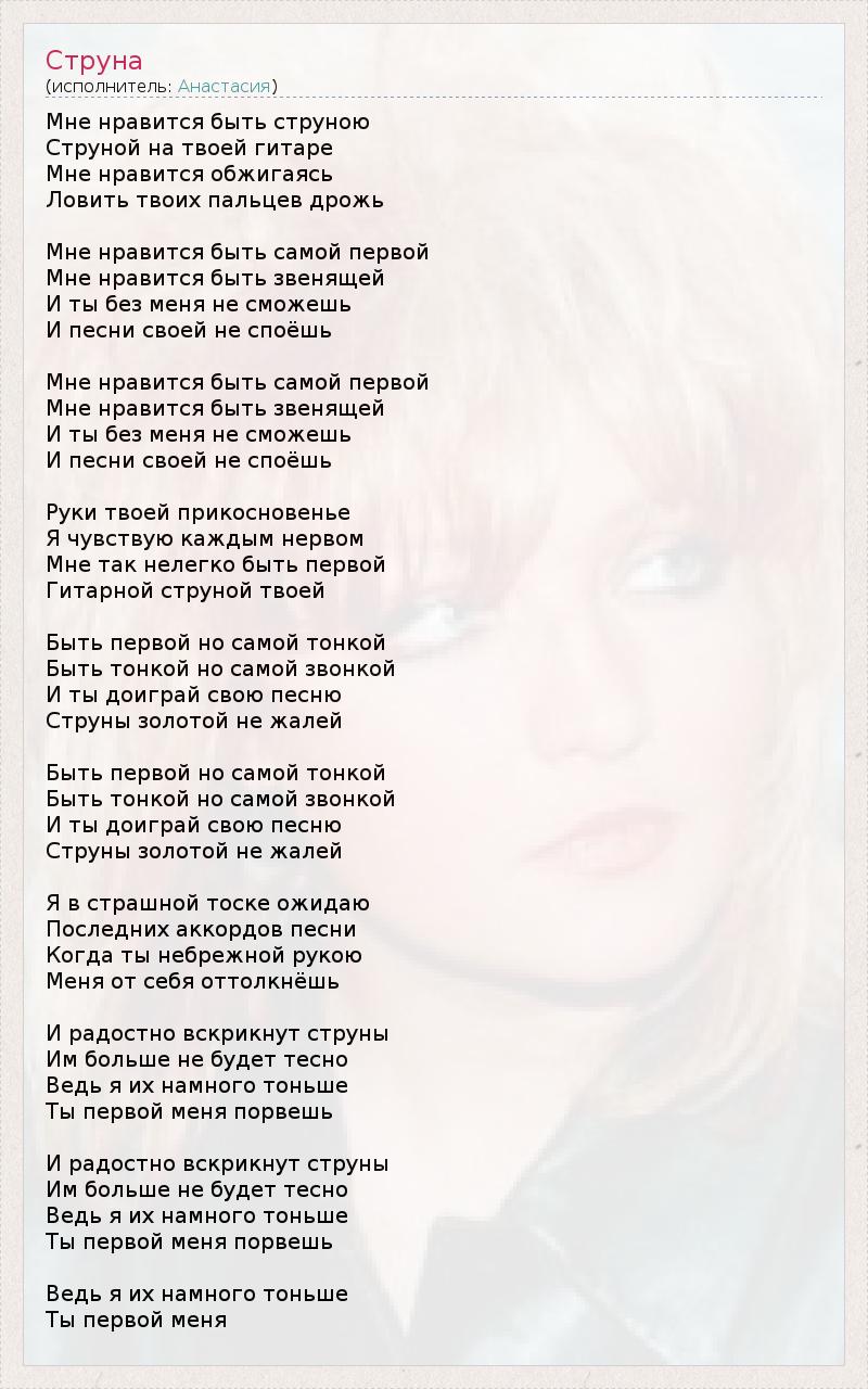 Мне нравится быть струною Струной на твоей гитаре Мне нравится обжигаясь Ловить твоих пальцев дрожь Мне нравится быть самой первой Мне нравится быть звенящей И ты без меня не сможешь И песни своей не споёшь Мне нравится быть самой первой Мне нравится быть звенящей И ты без меня не сможешь И песни своей не споёшь Руки твоей прикосновенье Я чувствую каждым нервом Мне так нелегко быть первой Гитарной струной твоей Быть первой но самой тонкой Быть тонкой но самой звонкой И ты доиграй свою песню Струны золотой не жалей Быть первой но самой тонкой Быть тонкой но самой звонкой И ты доиграй свою песню Струны золотой не жалей Я в страшной тоске ожидаю Последних аккордов песни Когда ты небрежной рукою Меня от себя оттолкнёшь И радостно вскрикнут струны Им больше не будет тесно Ведь я их намного тоньше Ты первой меня порвешь И радостно вскрикнут струны Им больше не будет тесно Ведь я их намного тоньше Ты первой меня порвешь Ведь я их намного тоньше Ты первой меня