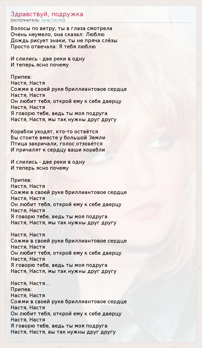 ГлавнаяИсполнителиАнастасияЗдравствуй, подружка