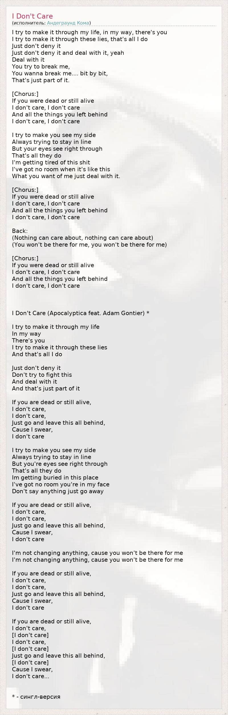I try to make it through my life, in my way, there's you I try to make it through these lies, that's all I do Just don't deny it Just don't deny it and deal with it, yeah Deal with it You try to break me, You wanna break me.... bit by bit, That's just part of it. [Chorus:] If you were dead or still alive I don't care, I don't care And all the things you left behind I don't care, I don't care I try to make you see my side Always trying to stay in line But your eyes see right through That's all they do I'm getting tired of this shit I've got no room when it's like this What you want of me just deal with it. [Chorus:] If you were dead or still alive I don't care, I don't care And all the things you left behind I don't care, I don't care Back: (Nothing can care about, nothing can care about) (You won't be there for me, you won't be there for me) [Chorus:] If you were dead or still alive I don't care, I don't care And all the things you left behind I don't care, I don't care I Don't Care (Apocalyptica feat. Adam Gontier) * I try to make it through my life In my way There's you I try to make it through these lies And that's all I do Just don't deny it Don't try to fight this And deal with it And that's just part of it If you are dead or still alive, I don't care, I don't care, Just go and leave this all behind, Cause I swear, I don't care I try to make you see my side Always trying to stay in line But you're eyes see right through That's all they do Im getting buried in this place I've got no room you're in my face Don't say anything just go away If you are dead or still alive, I don't care, I don't care, Just go and leave this all behind, Cause I swear, I don't care I'm not changing anything, cause you won't be there for me I'm not changing anything, cause you won't be there for me If you are dead or still alive, I don't care, I don't care, Just go and leave this all behind, Cause I swear, I don't care If you are dead or still alive, I don't care, [I don't care] I don't care, [I don't care] Just go and leave this all behind, [I don't care] Cause I swear, I don't care... * - сингл-версия