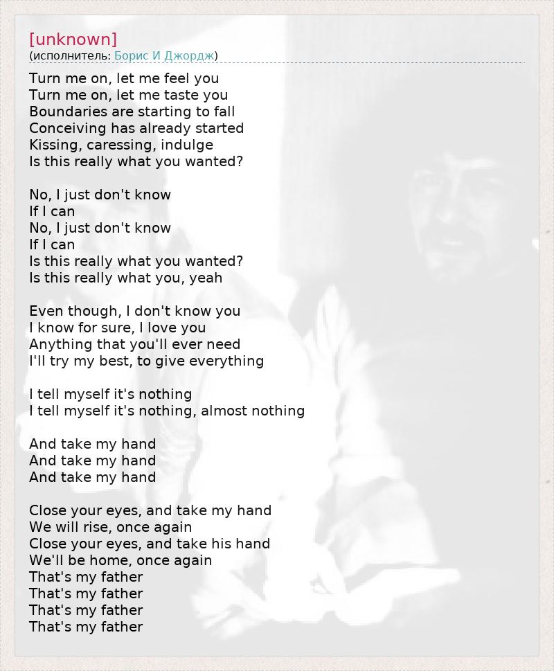 Turn me on, let me feel you Turn me on, let me taste you Boundaries are starting to fall Conceiving has already started Kissing, caressing, indulge Is this really what you wanted? No, I just don't know If I can No, I just don't know If I can Is this really what you wanted? Is this really what you, yeah Even though, I don't know you I know for sure, I love you Anything that you'll ever need I'll try my best, to give everything I tell myself it's nothing I tell myself it's nothing, almost nothing And take my hand And take my hand And take my hand Close your eyes, and take my hand We will rise, once again Close your eyes, and take his hand We'll be home, once again That's my father That's my father That's my father That's my father
