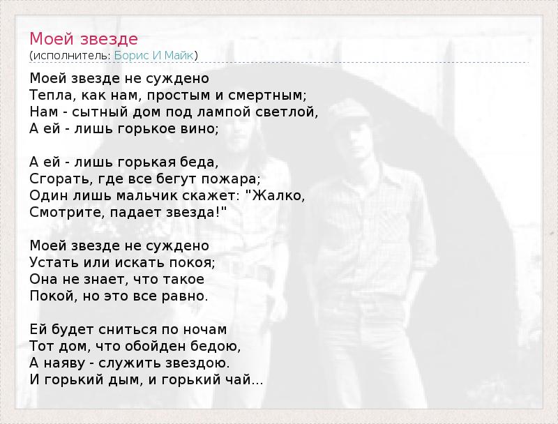 Моей звезде не суждено Тепла, как нам, простым и смертным; Нам - сытный дом под лампой светлой, А ей - лишь горькое вино; А ей - лишь горькая беда, Сгорать, где все бегут пожара; Один лишь мальчик скажет: "Жалко, Смотрите, падает звезда!" Моей звезде не суждено Устать или искать покоя; Она не знает, что такое Покой, но это все равно. Ей будет сниться по ночам Тот дом, что обойден бедою, А наяву - служить звездою. И горький дым, и горький чай...