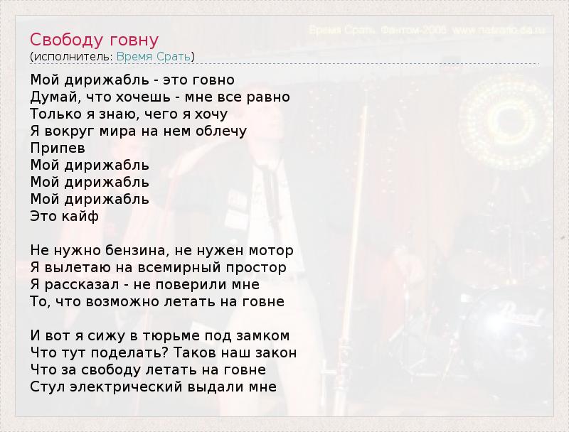 Мой дирижабль - это говно Думай, что хочешь - мне все равно Только я знаю, чего я хочу Я вокруг мира на нем облечу Припев Мой дирижабль Мой дирижабль Мой дирижабль Это кайф Не нужно бензина, не нужен мотор Я вылетаю на всемирный простор Я рассказал - не поверили мне То, что возможно летать на говне И вот я сижу в тюрьме под замком Что тут поделать? Таков наш закон Что за свободу летать на говне Стул электрический выдали мне