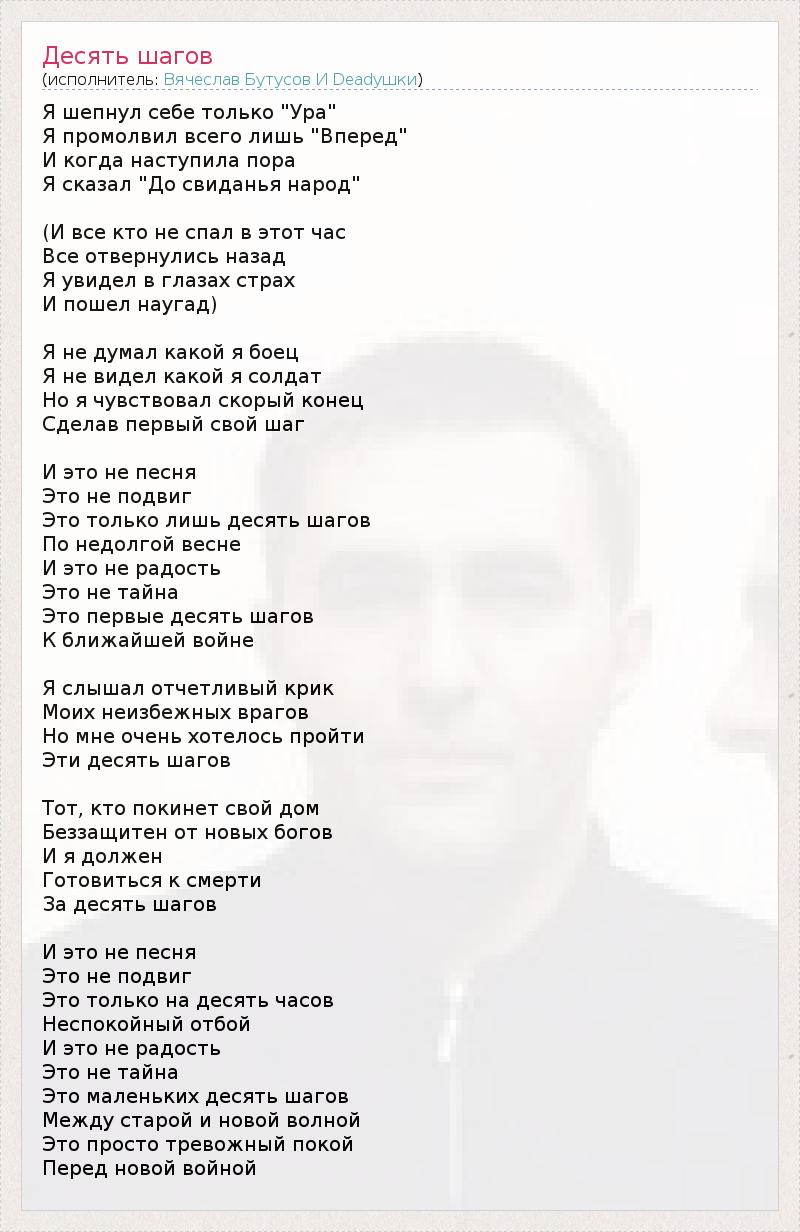 Я шепнул себе только "Ура" Я промолвил всего лишь "Вперед" И когда наступила пора Я сказал "До свиданья народ" (И все кто не спал в этот час Все отвернулись назад Я увидел в глазах страх И пошел наугад) Я не думал какой я боец Я не видел какой я солдат Но я чувствовал скорый конец Сделав первый свой шаг И это не песня Это не подвиг Это только лишь десять шагов По недолгой весне И это не радость Это не тайна Это первые десять шагов К ближайшей войне Я слышал отчетливый крик Моих неизбежных врагов Но мне очень хотелось пройти Эти десять шагов Тот, кто покинет свой дом Беззащитен от новых богов И я должен Готовиться к смерти За десять шагов И это не песня Это не подвиг Это только на десять часов Неспокойный отбой И это не радость Это не тайна Это маленьких десять шагов Между старой и новой волной Это просто тревожный покой Перед новой войной