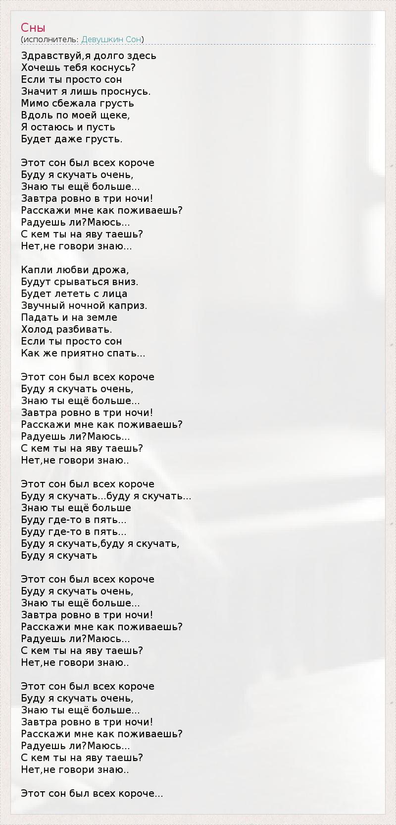 Это интересно:В августе 1993 года будущему композитору группы Андрею Чертищеву приснилось интересное словосочетание Девушкин Сон, и на следующий день он рассказал об этом своему приятелю Дмитрию Быкову. Было решено, что такому хорошему названию пропадать нельзя, нужно будет обязательно собрать под него группу, и непременно с женским вокалом. Осенью 93 в маленькой комнатке дома, в районе парка Победы,... продолжение