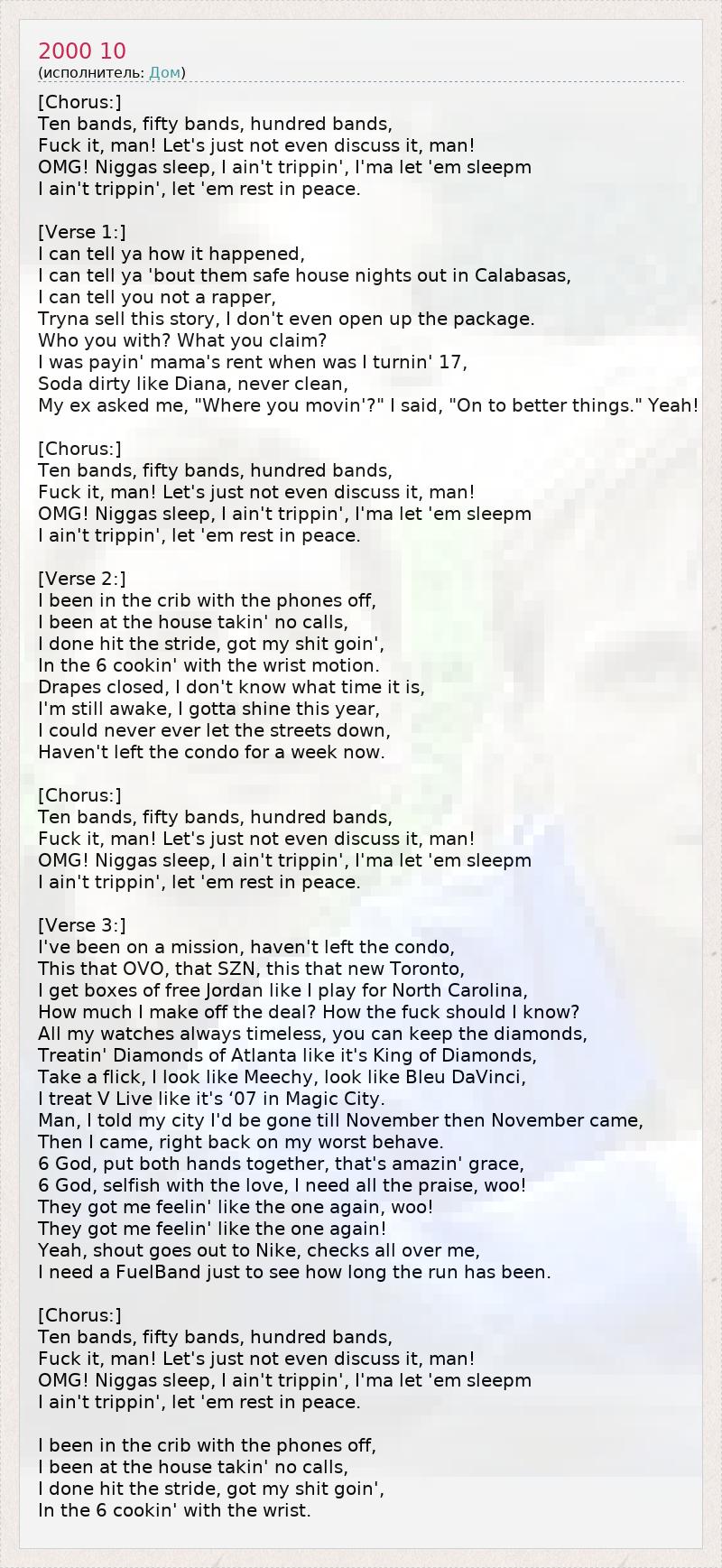 [Chorus:] Ten bands, fifty bands, hundred bands, Fuck it, man! Let's just not even discuss it, man! OMG! Niggas sleep, I ain't trippin', I'ma let 'em sleepm I ain't trippin', let 'em rest in peace. [Verse 1:] I can tell ya how it happened, I can tell ya 'bout them safe house nights out in Calabasas, I can tell you not a rapper, Tryna sell this story, I don't even open up the package. Who you with? What you claim? I was payin' mama's rent when was I turnin' 17, Soda dirty like Diana, never clean, My ex asked me, "Where you movin'?" I said, "On to better things." Yeah! [Chorus:] Ten bands, fifty bands, hundred bands, Fuck it, man! Let's just not even discuss it, man! OMG! Niggas sleep, I ain't trippin', I'ma let 'em sleepm I ain't trippin', let 'em rest in peace. [Verse 2:] I been in the crib with the phones off, I been at the house takin' no calls, I done hit the stride, got my shit goin', In the 6 cookin' with the wrist motion. Drapes closed, I don't know what time it is, I'm still awake, I gotta shine this year, I could never ever let the streets down, Haven't left the condo for a week now. [Chorus:] Ten bands, fifty bands, hundred bands, Fuck it, man! Let's just not even discuss it, man! OMG! Niggas sleep, I ain't trippin', I'ma let 'em sleepm I ain't trippin', let 'em rest in peace. [Verse 3:] I've been on a mission, haven't left the condo, This that OVO, that SZN, this that new Toronto, I get boxes of free Jordan like I play for North Carolina, How much I make off the deal? How the fuck should I know? All my watches always timeless, you can keep the diamonds, Treatin' Diamonds of Atlanta like it's King of Diamonds, Take a flick, I look like Meechy, look like Bleu DaVinci, I treat V Live like it's ‘07 in Magic City. Man, I told my city I'd be gone till November then November came, Then I came, right back on my worst behave. 6 God, put both hands together, that's amazin' grace, 6 God, selfish with the love, I need all the praise, woo! They got me feelin' like the one again, woo! They got me feelin' like the one again! Yeah, shout goes out to Nike, checks all over me, I need a FuelBand just to see how long the run has been. [Chorus:] Ten bands, fifty bands, hundred bands, Fuck it, man! Let's just not even discuss it, man! OMG! Niggas sleep, I ain't trippin', I'ma let 'em sleepm I ain't trippin', let 'em rest in peace. I been in the crib with the phones off, I been at the house takin' no calls, I done hit the stride, got my shit goin', In the 6 cookin' with the wrist.