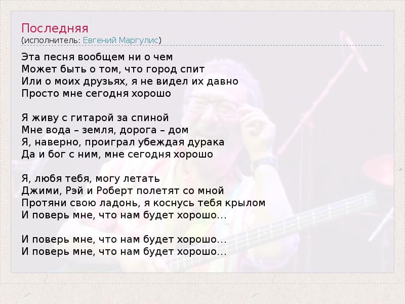 Это интересно:Евгений Шулимович Маргулис — автор, гитарист, бас-гитарист, бывший участник группы «Воскресение». Заслуженный артист России. Родился 24 декабря 1955 года в Москве. Один из ярчайших представителей независимого течения в русском рок-н-ролле. Недолго учился в мединституте, приобщился к музыке в 17 лет, первая купленная гитара стоила 7 руб. 50 коп.... продолжение
