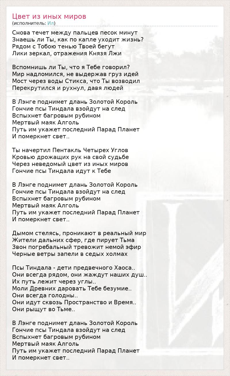 Снова течет между пальцев песок минут Знаешь ли Ты, как по капле уходит жизнь? Рядом с Тобою тенью Твоей бегут Лики зеркал, отражения Князя Лжи Вспомнишь ли Ты, что я Тебе говорил? Мир надломился, не выдержав груз идей Мост через воды Стикса, что Ты возводил Перекрутился и рухнул, давя людей В Лэнге поднимет длань Золотой Король Гончие псы Тиндала взойдут на след Вспыхнет багровым рубином Мертвый маяк Алголь Путь им укажет последний Парад Планет И померкнет свет.. Ты начертил Пентакль Четырех Углов Кровью дрожащих рук на свой судьбе Через неведомый цвет из иных миров Гончие псы Тиндала идут к Тебе В Лэнге поднимет длань Золотой Король Гончие псы Тиндала взойдут на след Вспыхнет багровым рубином Мертвый маяк Алголь Путь им укажет последний Парад Планет И померкнет свет.. Дымом стелясь, проникают в реальный мир Жители дальних сфер, где пирует Тьма Звон погребальный тревожит немой эфир Черные ветры запели в седых холмах Псы Тиндала - дети предвечного Хаоса.. Они всегда рядом, они жаждут наших душ.. Их путь лежит через углы.. Моли Древних даровать Тебе безумие.. Они всегда голодны.. Они идут сквозь Пространство и Время.. Они рыщут во Тьме.. В Лэнге поднимет длань Золотой Король Гончие псы Тиндала взойдут на след Вспыхнет багровым рубином Мертвый маяк Алголь Путь им укажет последний Парад Планет И померкнет свет..