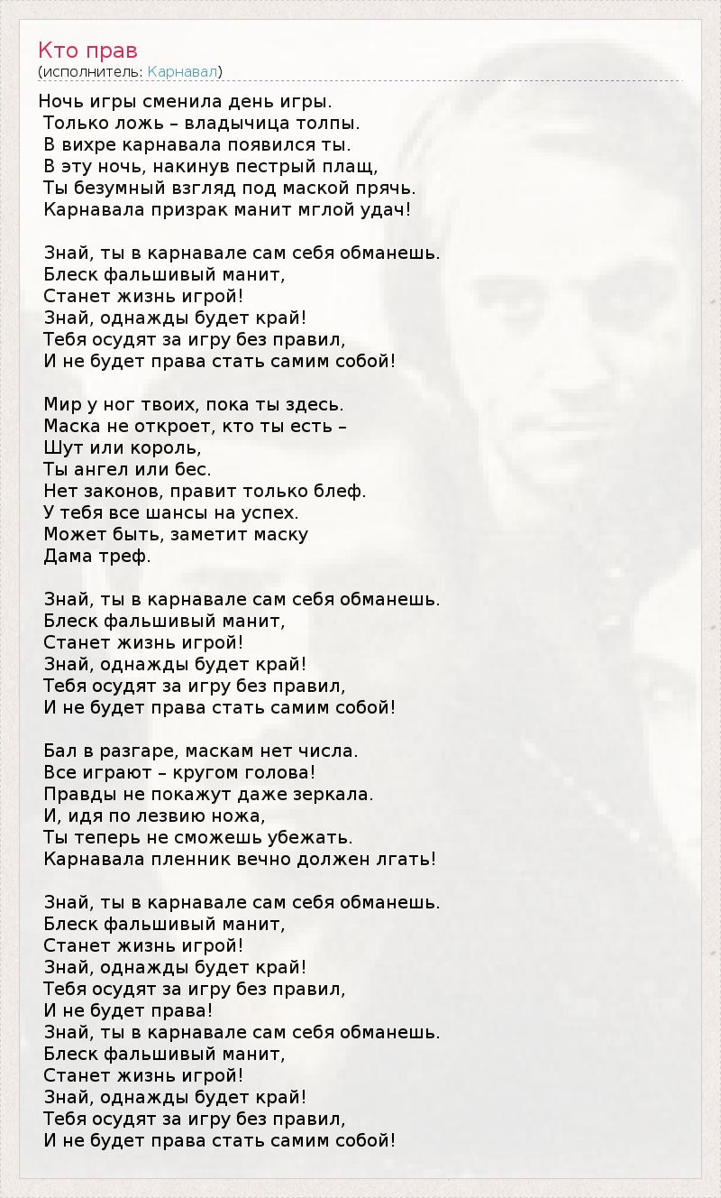 Это интересно:«Карнавал» — советская рок-группа, созданная в 1979 году Александром Барыкиным и Владимиром Кузьминым.В начале своего творчества группа «Карнавал» работала в ресторане, выступала с концертной программой в стиле традиционного рока, «новой волны» и «реггей» на эстраде в московских клубах и ДК. Работа в данном случае давала ребятам свободу в их музыкальном творчестве. В репертуаре группы... продолжение