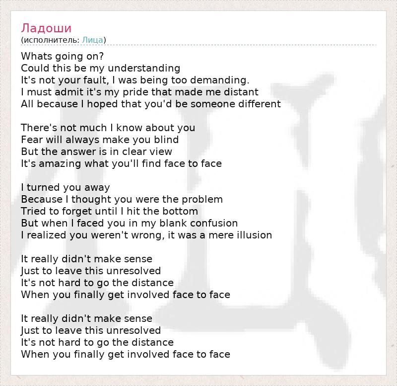 Что происходит? Может быть, это моё восприятие? Это не твоя вина, я был слишком требовательным. Я должен признать, что моя гордость заставила меня отдалиться, Всё потому, что я надеялся, что ты будешь другой. Надо же, я не так и много знаю о тебе... Страх всегда делает тебя слепым, Но ответ на виду. Удивительно, что вы обнаружите, встав лицом к лицу Я отверг тебя, Потому что считал тебя проблемой, Я пытался забыть об этом, пока не спустился на самое дно. Но когда я столкнулся с тобой в смятении, Я понял, что ты не ошиблась, это была просто иллюзия. В этом действительно нет смысла, Просто оставьте это нерешённым. Не так и трудно держаться на расстоянии, Когда ты, наконец, добился встречи лицом к лицу. В этом действительно нет смысла, Просто оставьте это нерешённым. Не так и трудно держаться на расстоянии, Когда ты, наконец, добился встречи лицом к лицу.