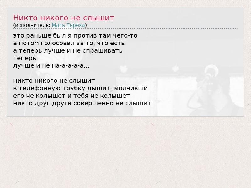 ГлавнаяИсполнителиМать ТерезаНикто никого не слышит