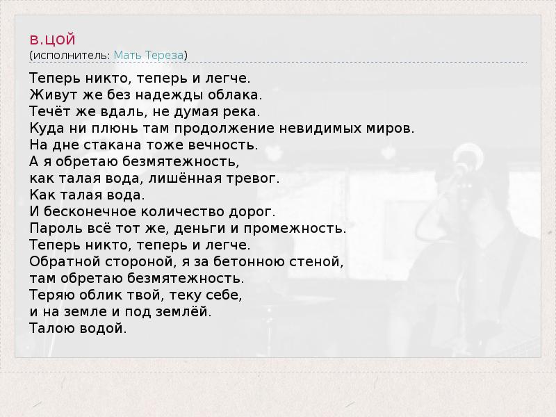 Теперь никто, теперь и легче. Живут же без надежды облака. Течёт же вдаль, не думая река. Куда ни плюнь там продолжение невидимых миров. На дне стакана тоже вечность. А я обретаю безмятежность, как талая вода, лишённая тревог. Как талая вода. И бесконечное количество дорог. Пароль всё тот же, деньги и промежность. Теперь никто, теперь и легче. Обратной стороной, я за бетонною стеной, там обретаю безмятежность. Теряю облик твой, теку себе, и на земле и под землёй. Талою водой.