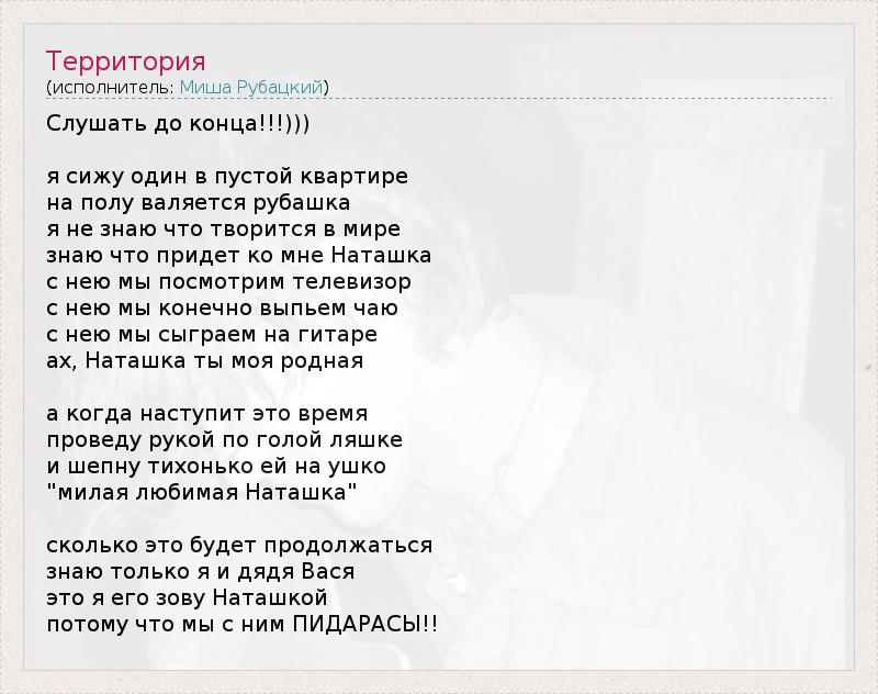 Слушать до конца!!!))) я сижу один в пустой квартире на полу валяется рубашка я не знаю что творится в мире знаю что придет ко мне Наташка с нею мы посмотрим телевизор с нею мы конечно выпьем чаю с нею мы сыграем на гитаре ах, Наташка ты моя родная а когда наступит это время проведу рукой по голой ляшке и шепну тихонько ей на ушко "милая любимая Наташка" сколько это будет продолжаться знаю только я и дядя Вася это я его зову Наташкой потому что мы с ним ПИДАРАСЫ!!