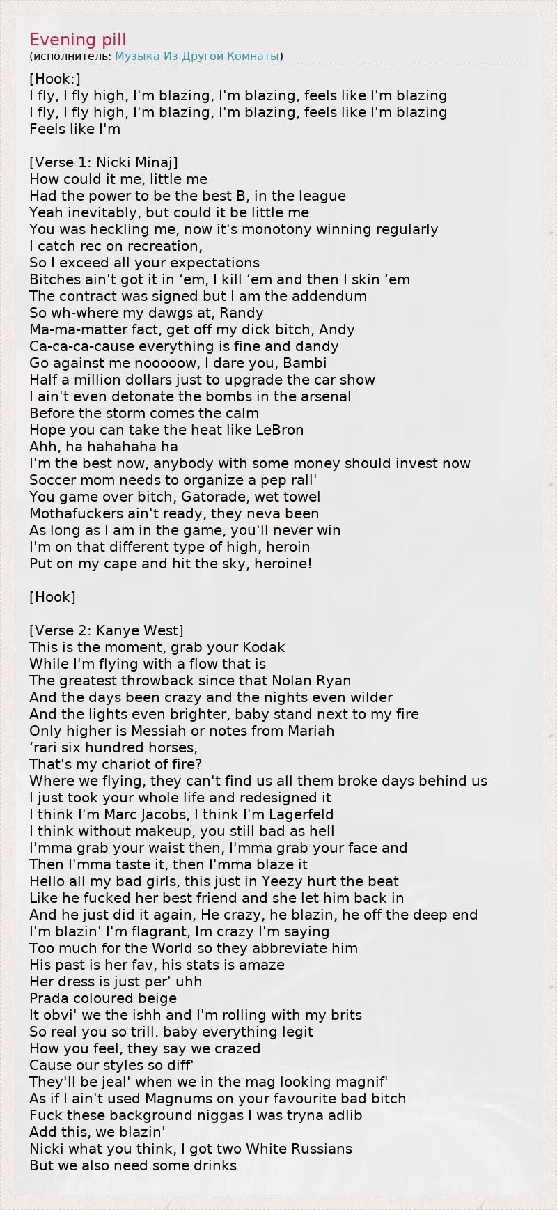 [Припев:] Я парю, высоко парю, я под кайфом, под кайфом, будто под кайфом. Я парю, высоко парю, я под кайфом, под кайфом, будто под кайфом. Будто я... [Куплет 1: Nicki Minaj] Как же у меня, маленькой, Хватило силы, чтобы быть лучшей с*кой в рэпе? Да, это неизбежно, но как же у меня, маленькой, получилось? Ты перебивала меня своими замечаниями, теперь же я постоянно выигрываю. Мои работы признают даже тогда, когда я просто развлекаюсь, Так что я превысила все твои ожидания. В с*чках этого нет, я убиваю их и сдираю кожу. Контракт подписан, но я дополнение. Так г-где же мой кореш, Рэнди? 1 Не-не-неоспоримо, вали с моего чл*на, с*ка, Энди, 2 По-по-по-потому что все круто, первоклассно. Выступи против меня прямо сейчас! Да тебе слабо, Бэмби. Полтора миллиона заплатила только за апгрейд тачки для шоу. Я еще даже не запустила бомбы из своего арсенала. Пока перед бурей затишье, Надеюсь, ты сможешь задать жару, как LeBron. 3 Аах, ха хахахаха ха! Отныне я самая лучшая, все, у кого есть деньги, должны в меня вложиться. Мамочке из трущоб надо устроить вечеринку перед игрой. Твоя игра окончена, с*чка, вытрись влажными полотенцами от Gatorade. 4 Убл*дки не готовы, да и никогда не были. До тех пор, пока я в рэп-индустрии, тебе не победить. Я сижу на другой наркоте, не героине. Надела свою накидку и полетела ввысь, героиня! [Припев] [Куплет 2: Kanye West] Этот момент стоит запечатления - То, как я читаю рэп, Величайший олдскул со времен Nolan Ryan. И дни были сумасшедшими, а ночи тем более. Огни и того ярче, детка будь со мной, пока я зажигаю. Выше меня только мессия или ноты, которые берет Мария. 5 Раритетная тачка с 600 лошадиными силами, Не это ли моя огненная колесница? Там, где мы летаем, нас не достать, нам нет дела до их проблем. Я просто взял твою жизнь и перекроил ее, Думается, я Marc Jacobs или Lagerfield. 6 Мне кажется, без макияжа ты все такая же уродина, Поэтому я возьму тебя за талию, схвачу тебя за лицо и Поцелую, а потом ударю. Привет, мои плохие девочки, это Yeezy, 7 делающий офигенный бит, Как будто он потр***лся с ее лучшей подругой, она простила его, А он снова за свое, он сумасшедший, он под кайфом, съехал с катушек. Я под кайфом, я ужасен, я говорю Миру слишком много, поэтому они урезают его. Его прошлое у нее в закладках, его заслуги поразительны. Ее платье просто идеально, ах, Бежевое от Prada. Очевидно, мы круты, и я тусуюсь со своими британками, Так что ты очень взволнованна, детка, все по-честному. Как ты себя чувствуешь? Говорят, мы сошли с ума, Потому что наши стили такие разные, Они нам еще позавидуют, когда увидят наши офигенные фотки в журналах. Как будто я не тр***л твою любимую плохую с*чку с презервативами. К черту этих ниг*еров с заднего плана, я испытывал вокальные эффекты. Добавьте: мы под кайфом. Никки, что думаешь, у меня две White Russian, 8 Но нам нужно еще выпивки. 1 – отсылка к Рэнди Джексону и его фразе "dawg" 2 – отсылка к комику Энди Дику (Andy Dick) 3 – отсылка к баскетболисту Джеймсу Леброну, который перешел из Cleveland Cavaliers в Miami Heat 4 – Gatorade – напиток для спортсменов 5 – певица 6 – дизайнеры 7 – псевдоним Кани Вэста 8 – коктейль