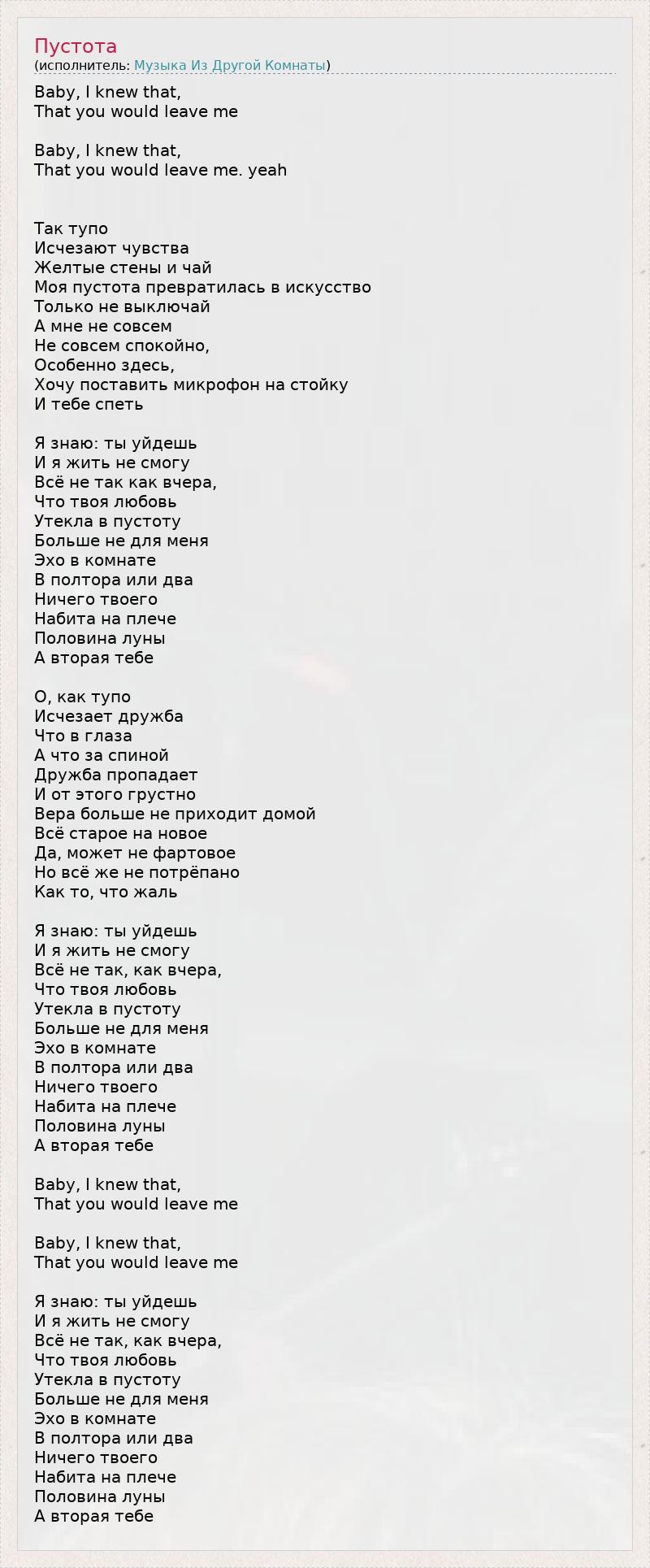 Это интересно:На стыке 2005-2006 в Иваново два давнишних друга Ильдар Авхадшин и Гоша Грушин, игравшие ранее в совместных проектах, решили снова играть вместе. Недолго думая, взяли в группу пару знакомых, желающих, но не очень умеющих играть и решили назвать команду "Музыка из другой комнаты".... продолжение