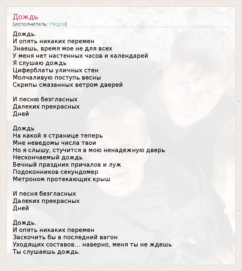 Дождь. И опять никаких перемен Знаешь, время мое не для всех У меня нет настенных часов и календарей Я слушаю дождь Циферблаты уличных стен Молчаливую поступь весны Скрипы смазанных ветром дверей И песню безгласных Далеких прекрасных Дней Дождь На какой я странице теперь Мне неведомы числа твои Но я слышу, стучится в мою ненадежную дверь Нескончаемый дождь Вечный праздник причалов и луж Подоконников секундомер Метроном протекающих крыш И песня безгласных Далеких прекрасных Дней Дождь. И опять никаких перемен Заскочить бы в последний вагон Уходящих составов… наверно, меня ты не ждешь Ты слушаешь дождь.