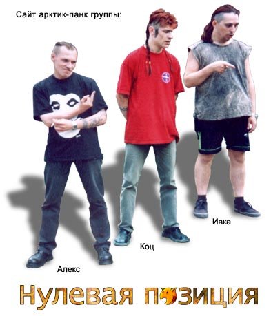 Это интересно: === Группа «Нулевая Позиция» ==== образована в г. Певек Чукотского автономного округа в 1996 году коллективом единомышленников типа раздолбаев. Сии типы это: Алексей «АЛЕКС» Семенихин — вокал; Вячеслав «ИВКА» Пилипёнок— гитара, бэк-вокал; Юрий «КОЦ» Коцарь — бас, бэк-вокал.С конца 2003 года коллектив перебрался в Москву для дальнейшего терзания струн, микрофонов и прочего музыкального... продолжение