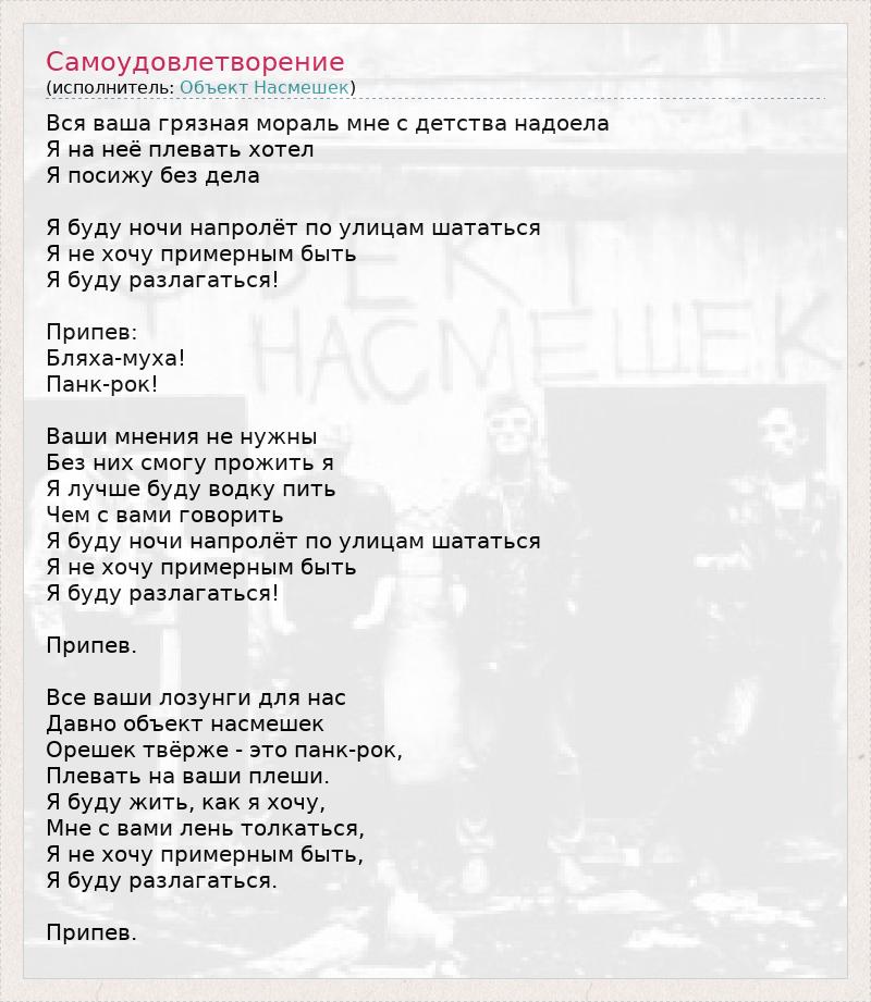 Вся ваша грязная мораль мне с детства надоела Я на неё плевать хотел Я посижу без дела Я буду ночи напролёт по улицам шататься Я не хочу примерным быть Я буду разлагаться! Припев: Бляха-муха! Панк-рок! Ваши мнения не нужны Без них смогу прожить я Я лучше буду водку пить Чем с вами говорить Я буду ночи напролёт по улицам шататься Я не хочу примерным быть Я буду разлагаться! Припев. Все ваши лозунги для нас Давно объект насмешек Орешек твёрже - это панк-рок, Плевать на ваши плеши. Я буду жить, как я хочу, Мне с вами лень толкаться, Я не хочу примерным быть, Я буду разлагаться. Припев.