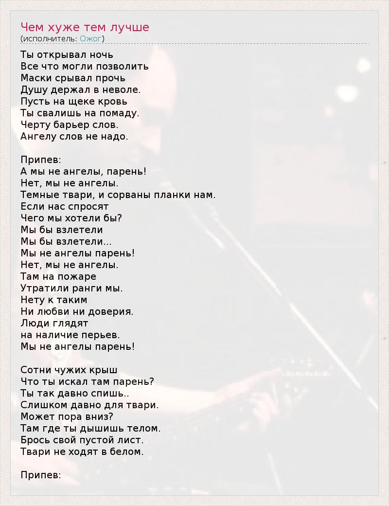 Ты открывал ночь Все что могли позволить Маски срывал прочь Душу держал в неволе. Пусть на щеке кровь Ты свалишь на помаду. Черту барьер слов. Ангелу слов не надо. Припев: А мы не ангелы, парень! Нет, мы не ангелы. Темные твари, и сорваны планки нам. Если нас спросят Чего мы хотели бы? Мы бы взлетели Мы бы взлетели... Мы не ангелы парень! Нет, мы не ангелы. Там на пожаре Утратили ранги мы. Нету к таким Ни любви ни доверия. Люди глядят на наличие перьев. Мы не ангелы парень! Сотни чужих крыш Что ты искал там парень? Ты так давно спишь.. Слишком давно для твари. Может пора вниз? Там где ты дышишь телом. Брось свой пустой лист. Твари не ходят в белом. Припев: