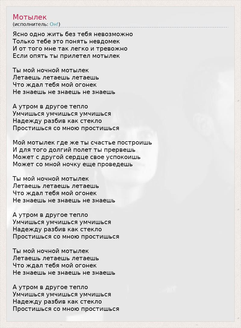 Ясно одно жить без тебя невозможно Только тебе это понять невдомек И от того мне так легко и тревожно Если опять ты прилетел мотылек Ты мой ночной мотылек Летаешь летаешь летаешь Что ждал тебя мой огонек Не знаешь не знаешь не знаешь А утром в другое тепло Умчишься умчишься умчишься Надежду разбив как стекло Простишься со мною простишься Мой мотылек где же ты счастье построишь И для того долгий полет ты прервешь Может с другой сердце свое успокоишь Может со мной ночку еще проведешь Ты мой ночной мотылек Летаешь летаешь летаешь Что ждал тебя мой огонек Не знаешь не знаешь не знаешь А утром в другое тепло Умчишься умчишься умчишься Надежду разбив как стекло Простишься со мною простишься Ты мой ночной мотылек Летаешь летаешь летаешь Что ждал тебя мой огонек Не знаешь не знаешь не знаешь А утром в другое тепло Умчишься умчишься умчишься Надежду разбив как стекло Простишься со мною простишься